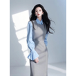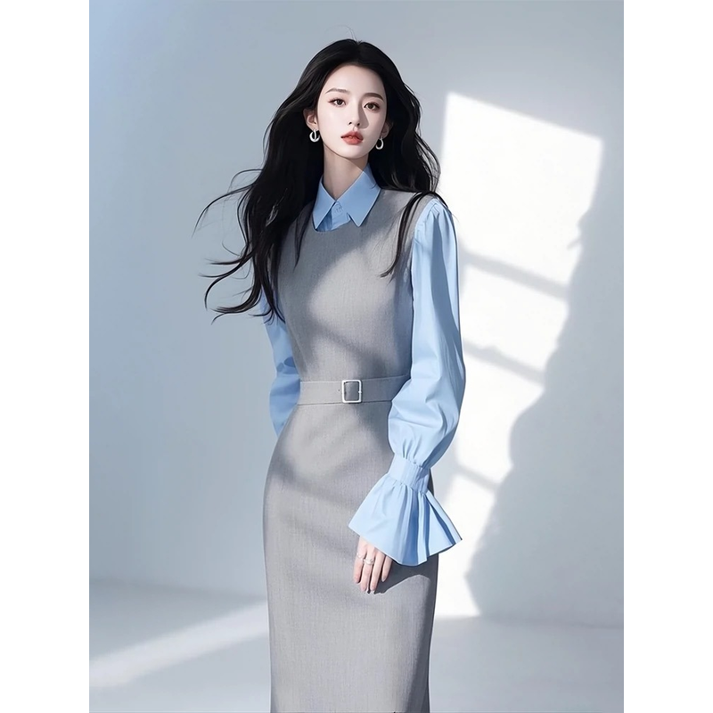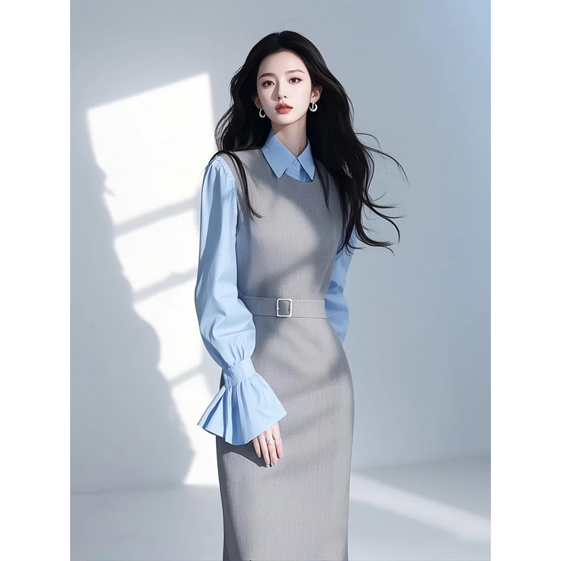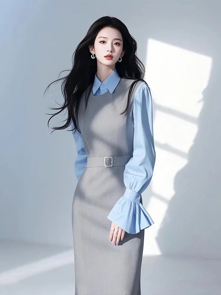 New High Quality Office Lady Autumn Suit Dress Set Women Lapel Long Sleeve Blue Shirt + Grey Vest Dresses with Belt 2 Piece Set
