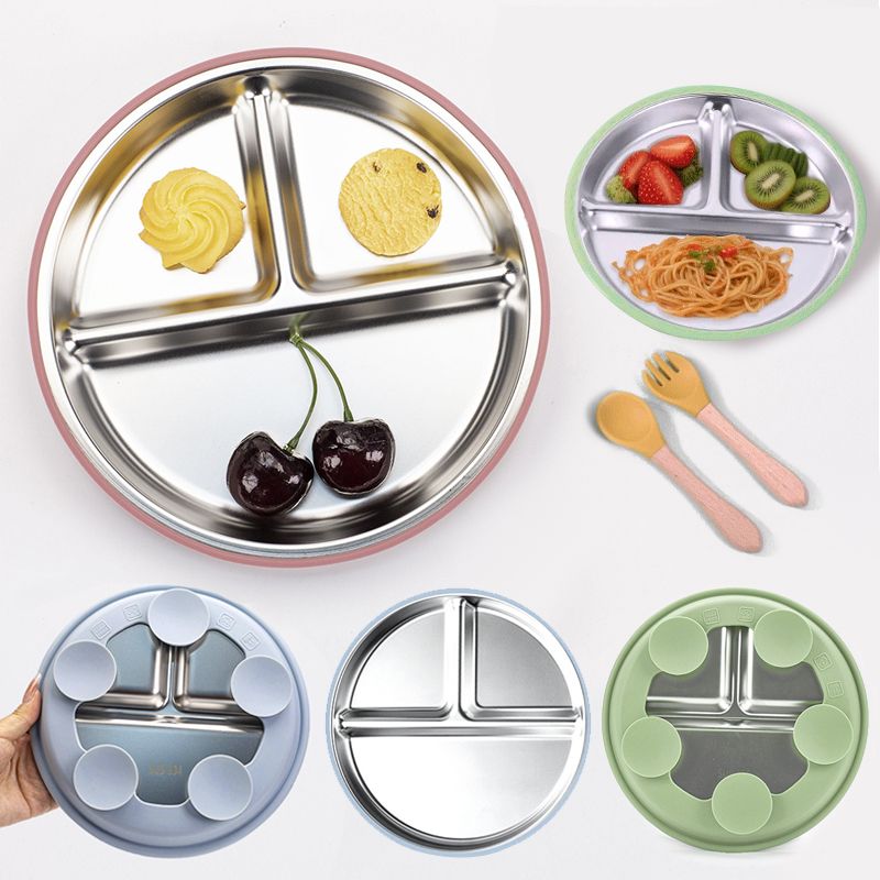 New Kids Tableware - 304 Stainless Steel Divided Plate with Silicone Suction Base for Babies