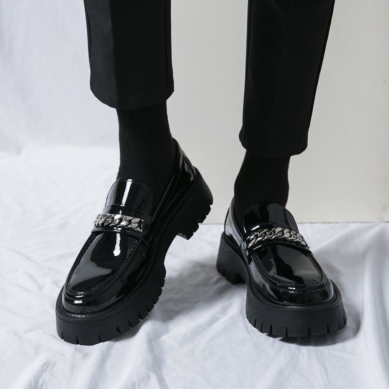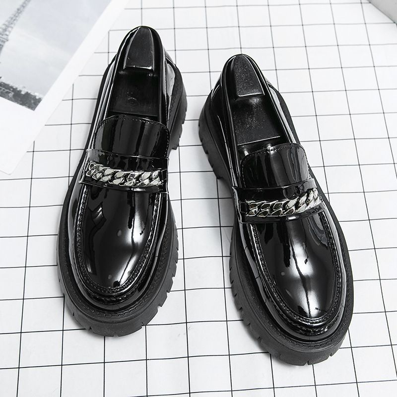 New Men's Big-Head Leather Shoes Thick-Soled High-Rise Patent Leather Glossy Casual Thick-Heeled Loafer Hairstylist Trendy Shoes