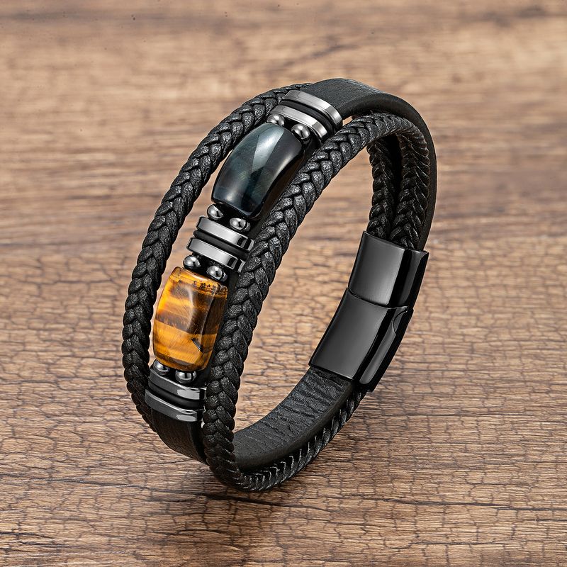 New Natural Tiger Eye Stone Men's Wristband Bracelet Hand-woven Multi-Layer Braided Leather Bangles Stainless Steel Jewelry