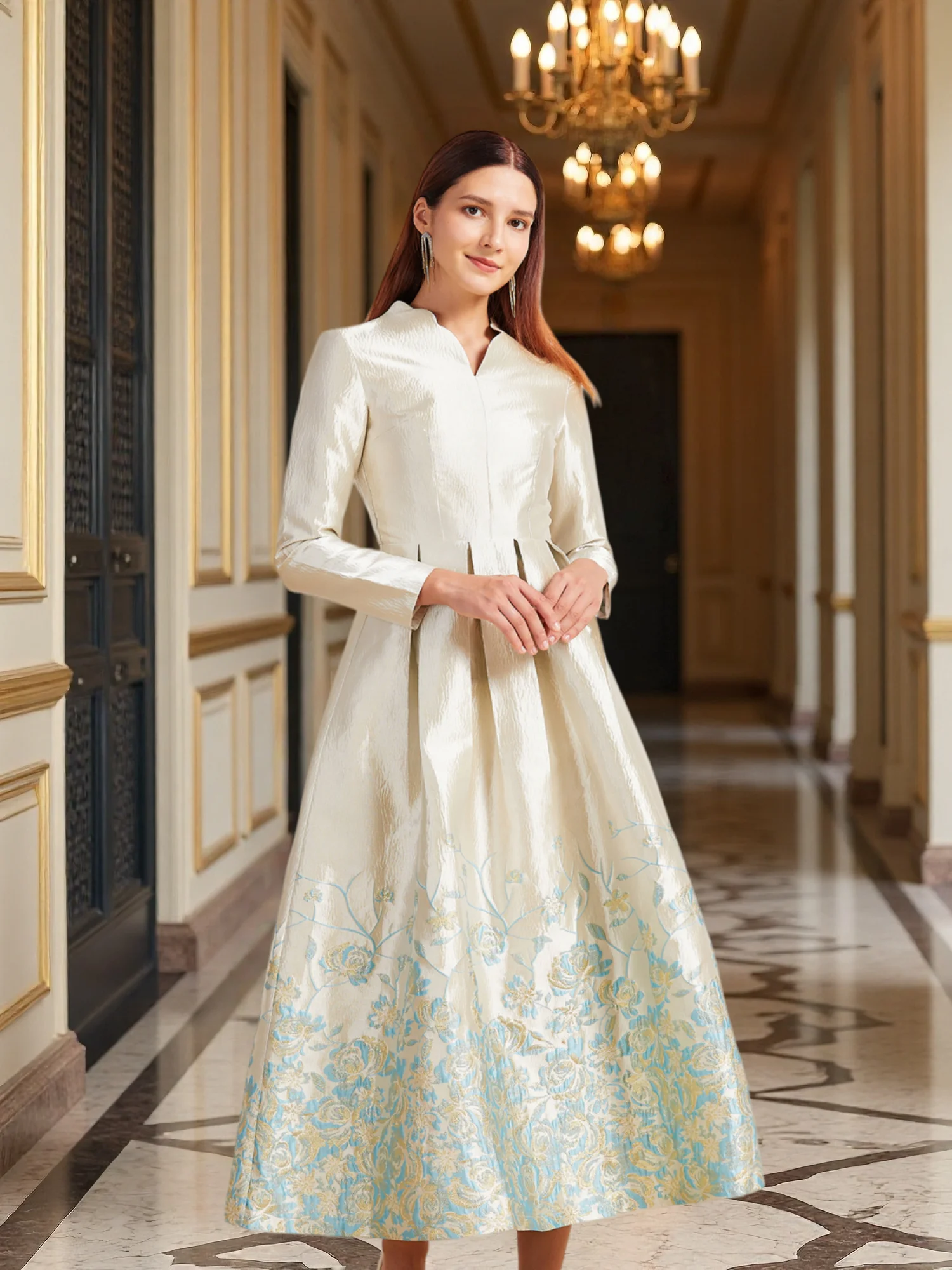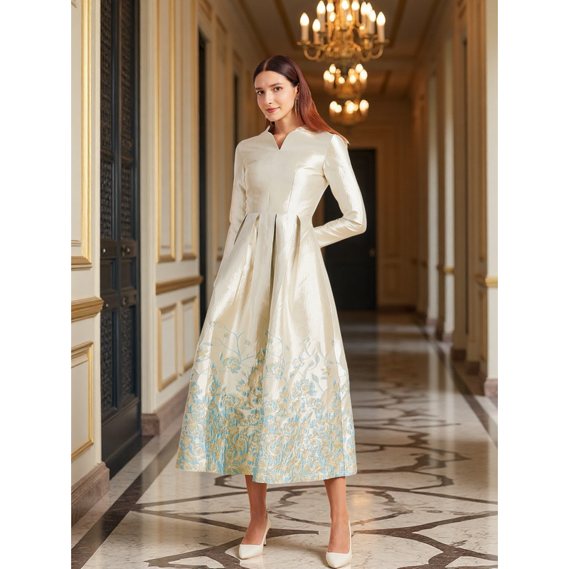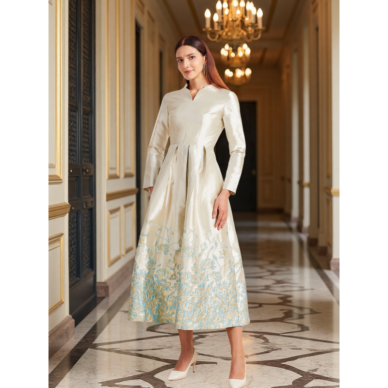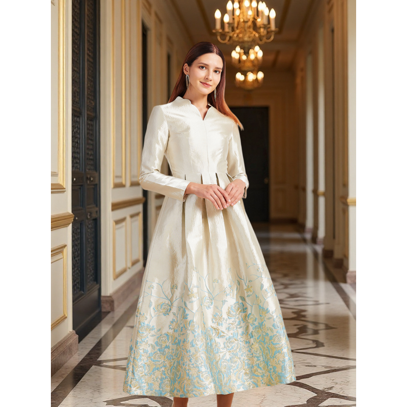 New Plus Size Slimming Dress - Champagne Gold Gradient Jacquard Stand-Collar Long Sleeve Tummy-Control Flared Evening Gown