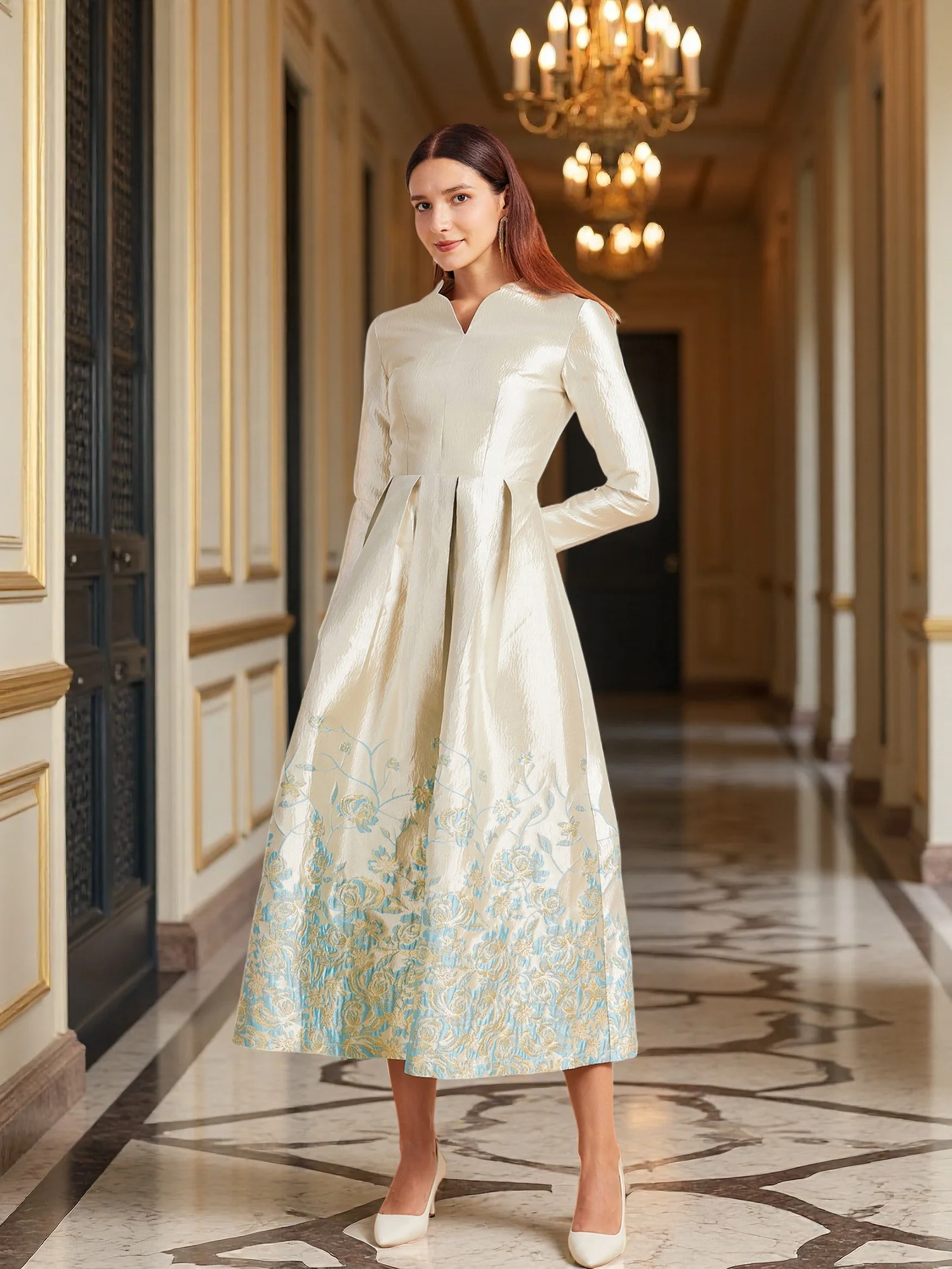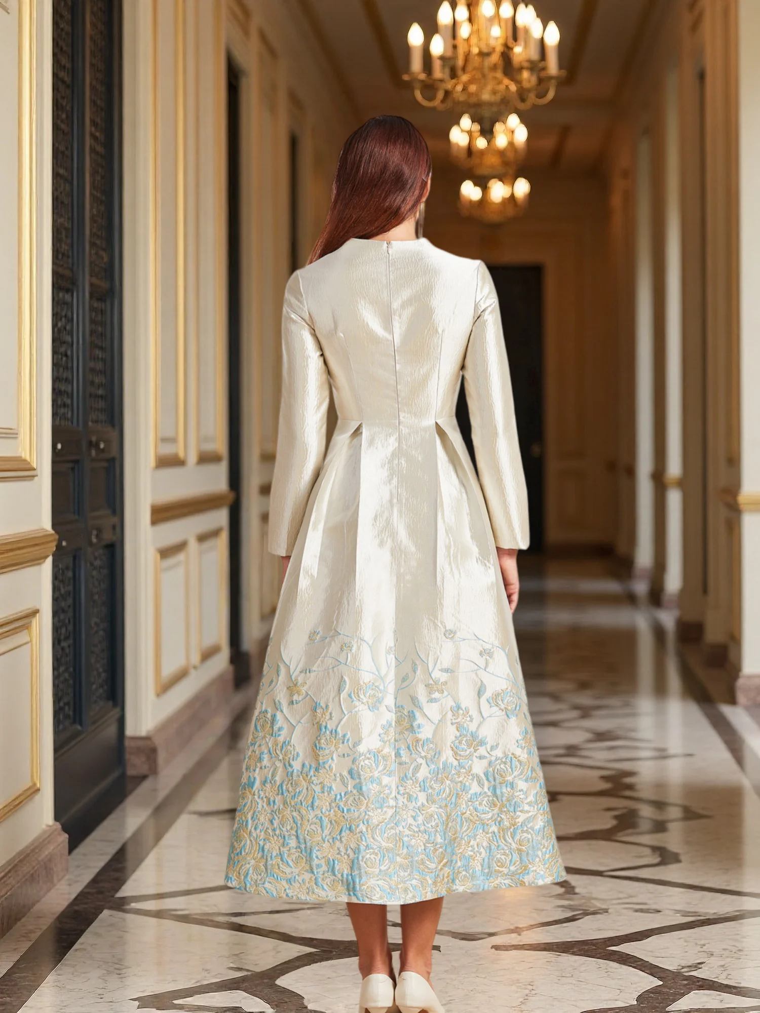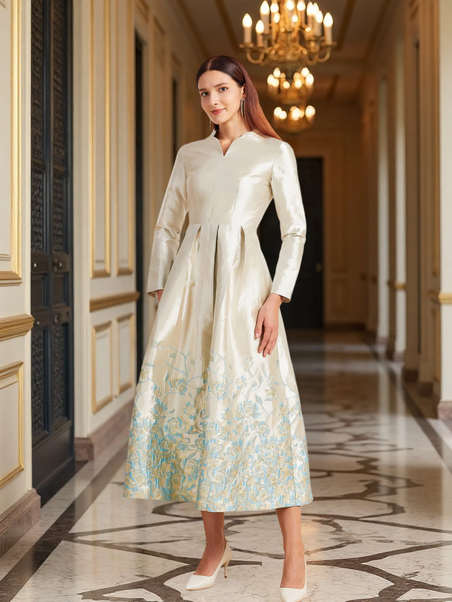New Plus Size Slimming Dress - Champagne Gold Gradient Jacquard Stand-Collar Long Sleeve Tummy-Control Flared Evening Gown