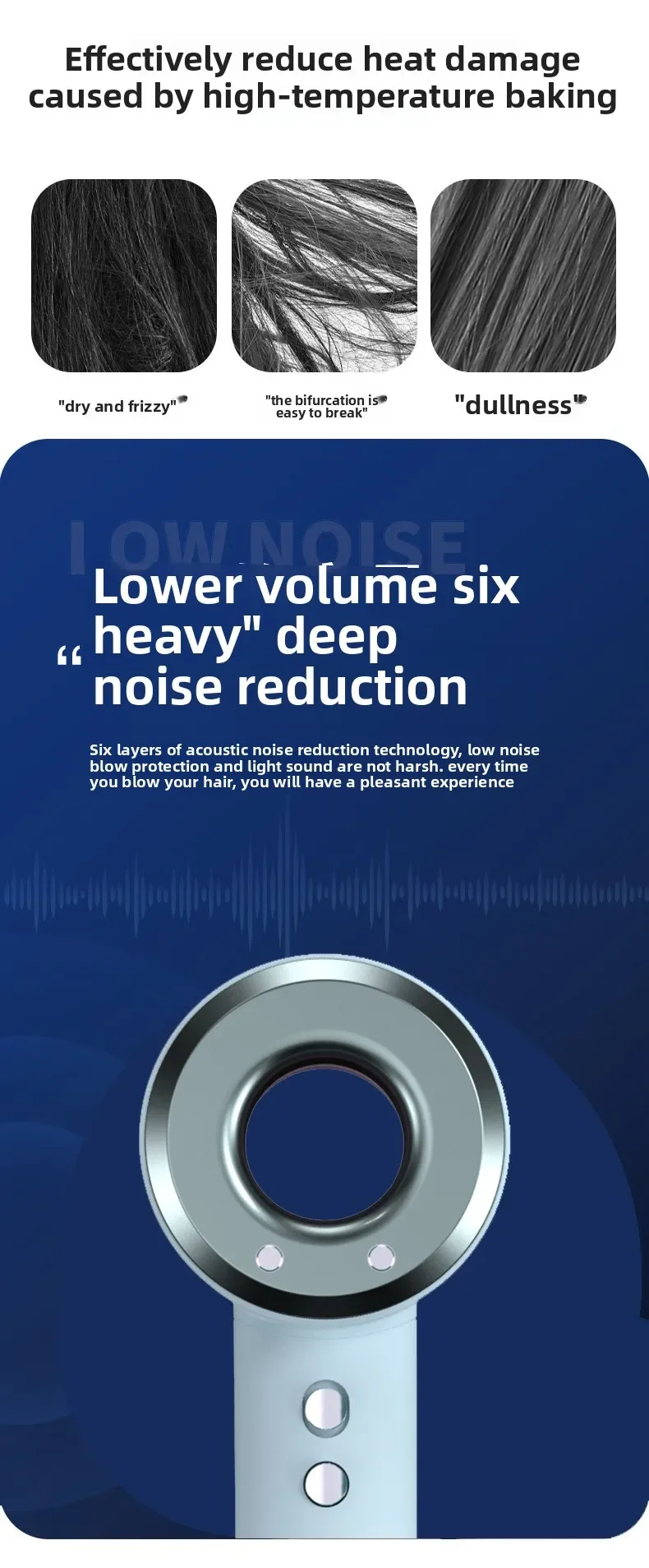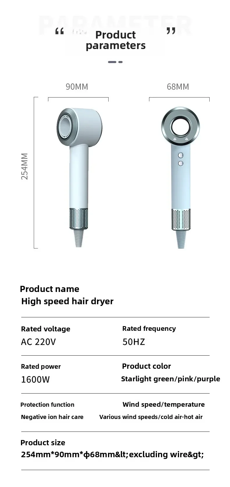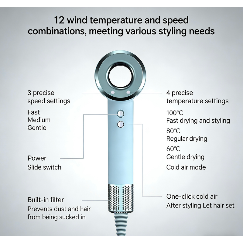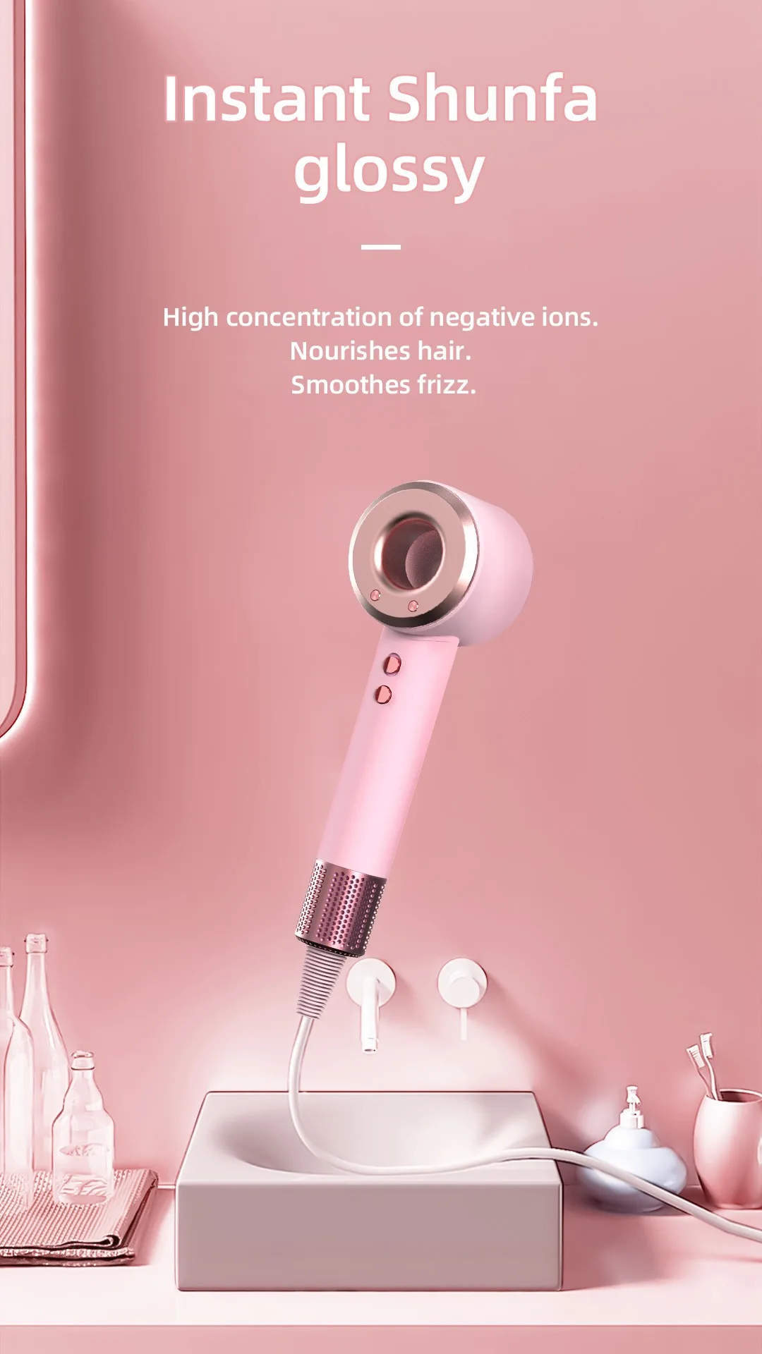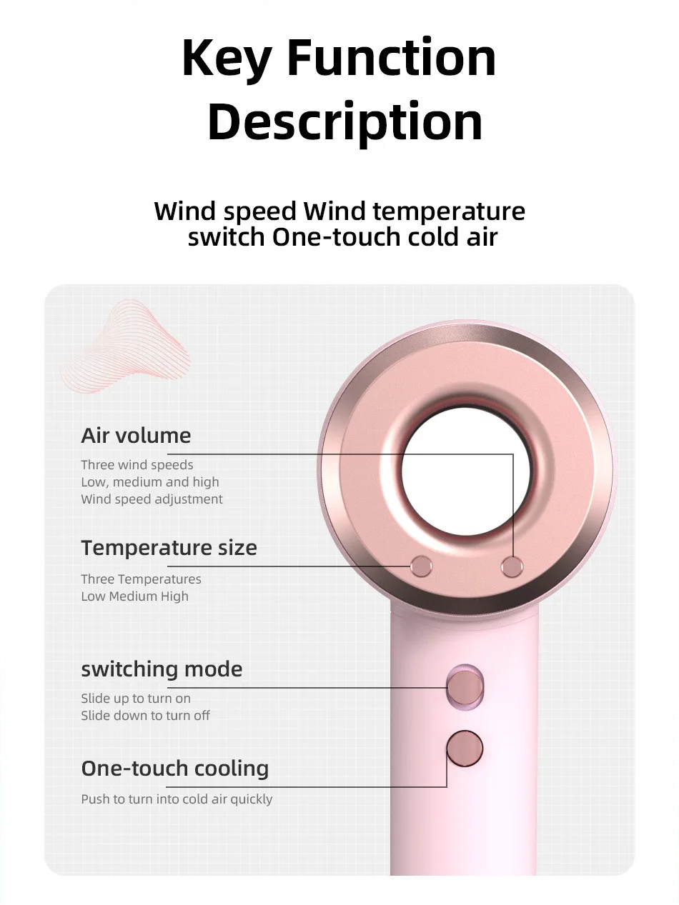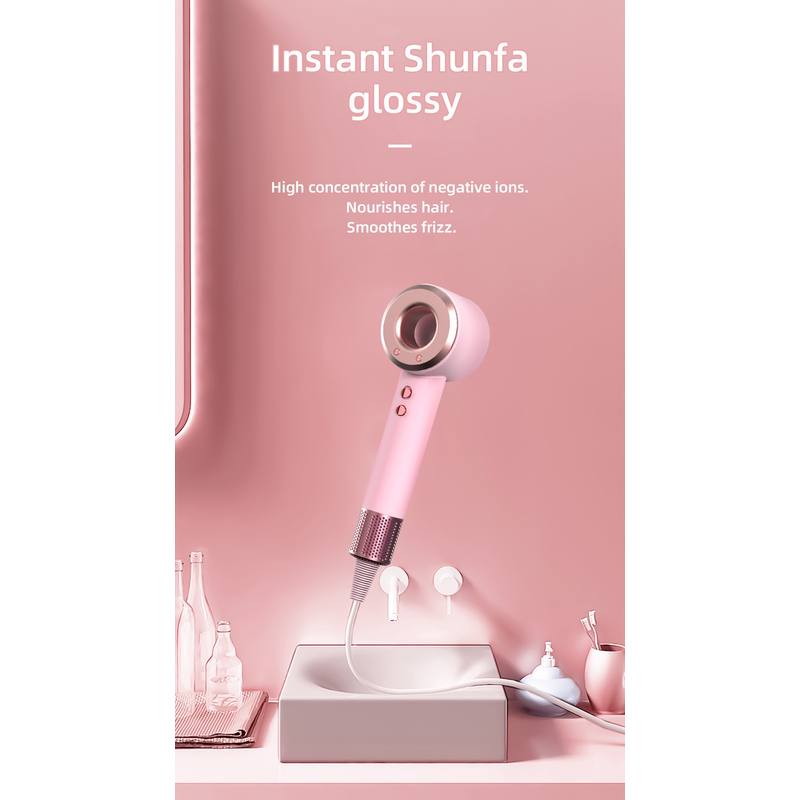 The hair dryer's negative ion function reduces frizz and static, leaving your hair smooth and shiny.