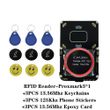 Support custom printing of 125Khz/13.56Mhz mobile phone stickers, standard cards, key strings and card readers.