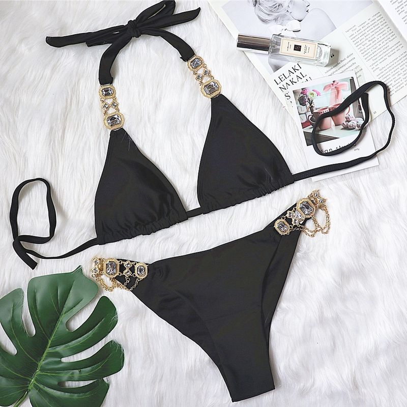 New Sexy Purple Halter Crystal Diamond Bikini 2021 Female Swimsuit Women Swimwear Rhinestone Bikini Black S