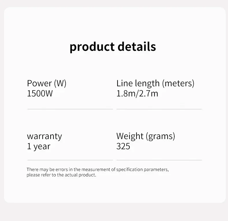 Optimize your hair styling routine with this durable, high-performance hair dryer—combining versatile styling tools, customizable heat settings, and professional power for flawless hair every day. The default length of the wire is 1.8. If you need a longer length, please contact customer service.