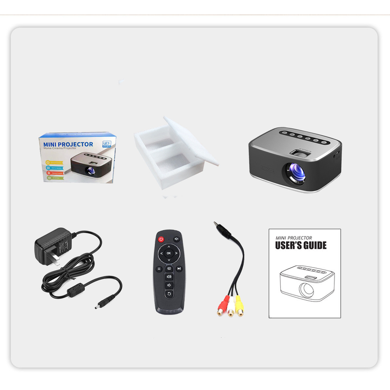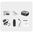 Accessories include: projector host *1 + power cord *1 + AV cable *1 + remote control *1 + manual *1 + packing box *1