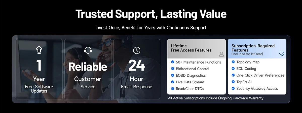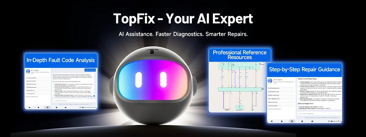 AI Topfix:Navigate complex diagnostics effortlessly using the advanced guided function, you’ll experience step-by-step assistance, making it easier to diagnose. Instantly decode, analyze, and resolve DTCs with AI-powered insights, minimizing downtime and maximizing accuracy. Perfectly tailored for a vast range of makes and models, ensuring versatility in every garage with this TOPDON scanner. Slash diagnostic time by 50% and tackle more jobs daily. Reduce comebacks, elevate customer trust, and grow your revenue.