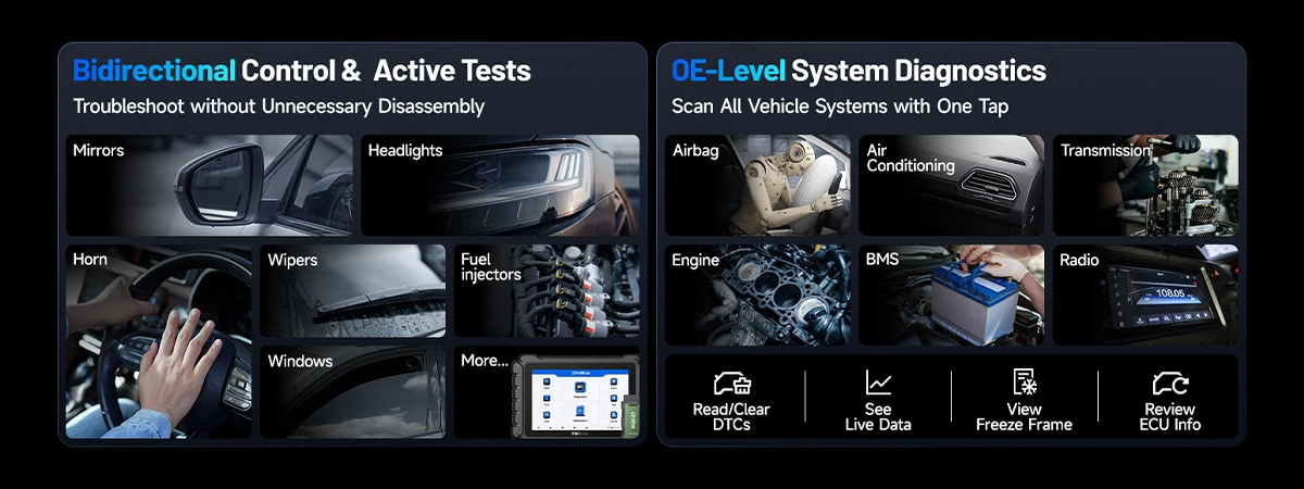 Active Test & Bi-directional control:one lite supports over bi-directional control functions, Send precise commands to multiple systems and components to check their working status. Achieve fast, accurate diagnostics and take control like never before.