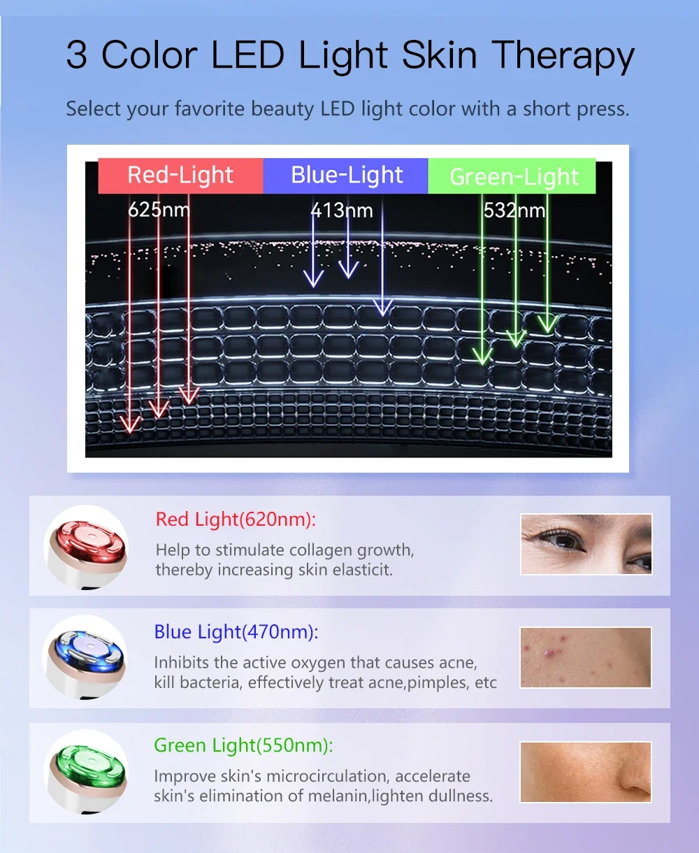 RF(1-6 gear;Red light): Red light therapy kill old cells,promote elastic fiber regeneration,stimulating collagen and elastin production,to plump and firm loose skin.