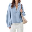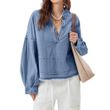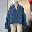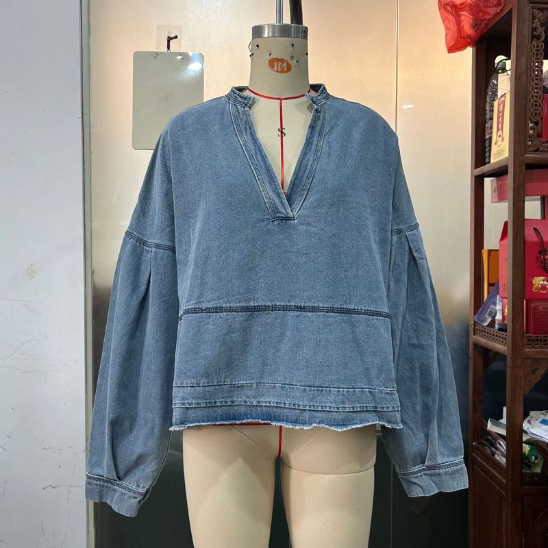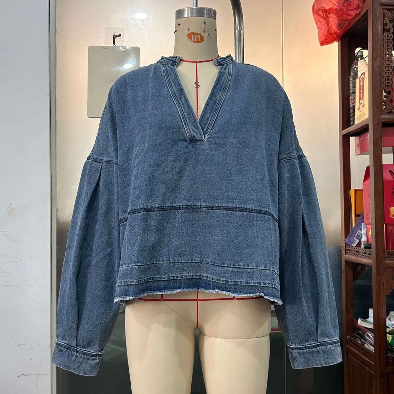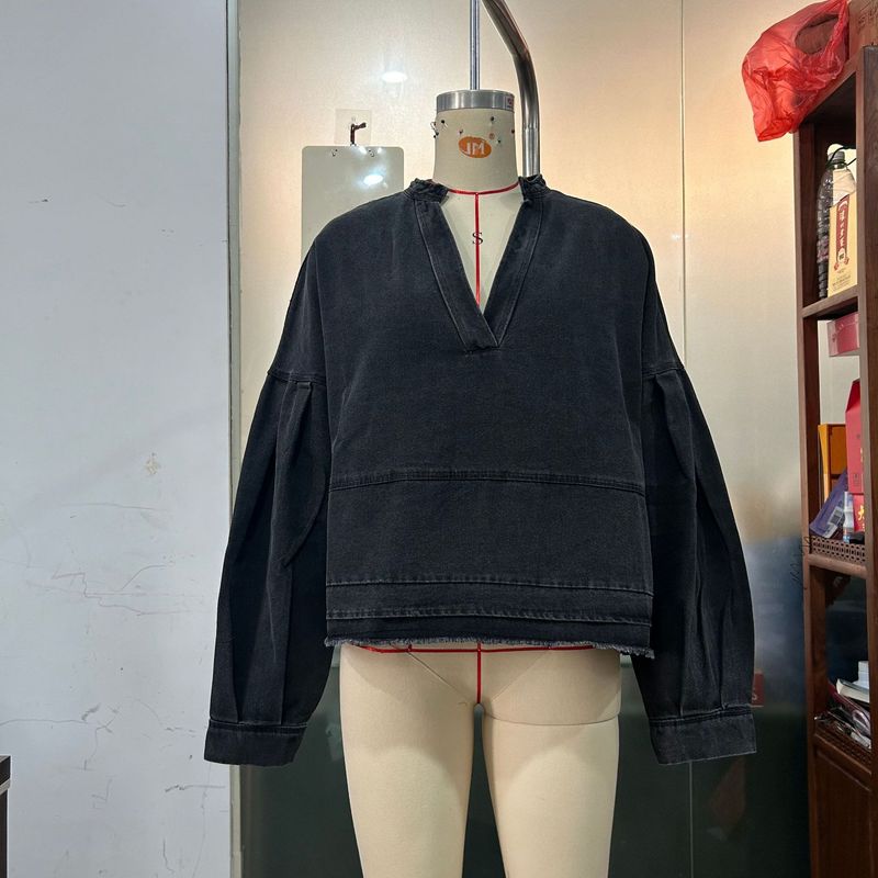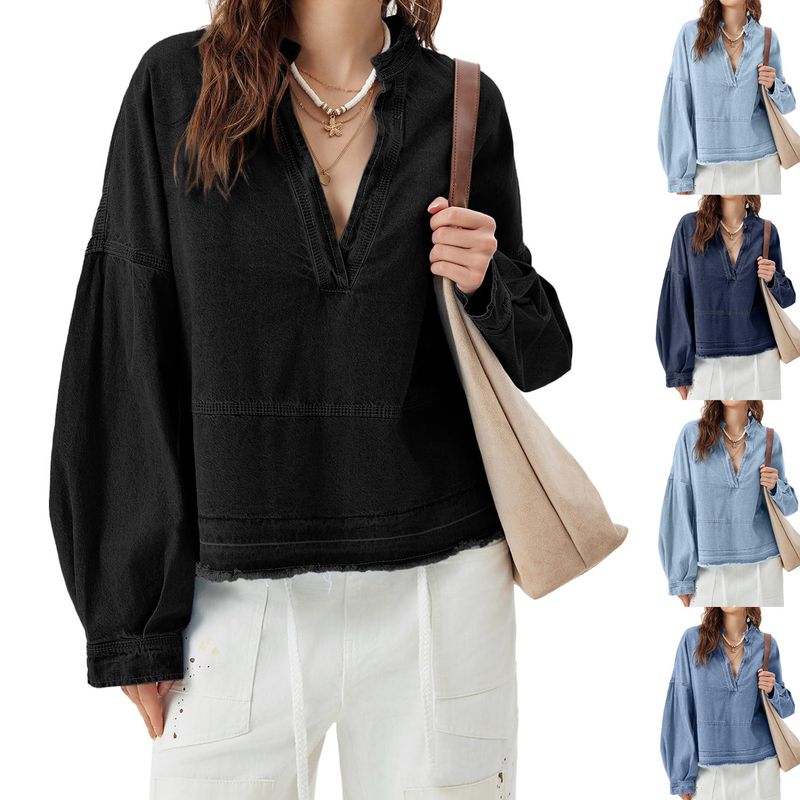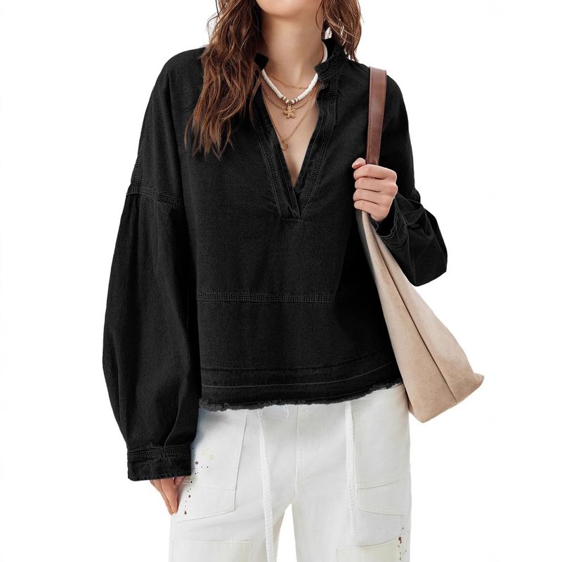 New V-neck Long Sleeve Loose Stitching Denim Long Sleeve Loose All-matching Top Black S