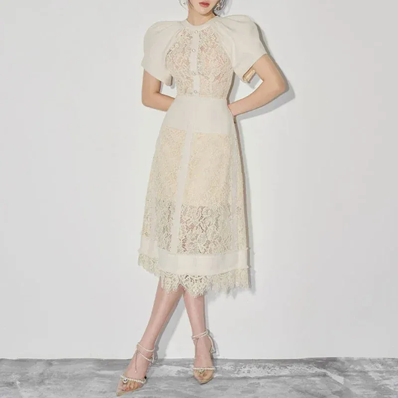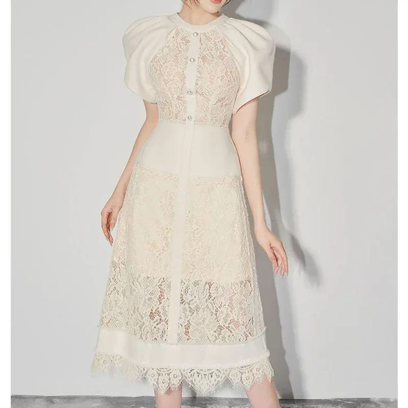 New Vintage Party Dress Women Hollow Out Puff Sleeve Bodycon Lady Clothing High Waisted Luxury Design Vestido Summer