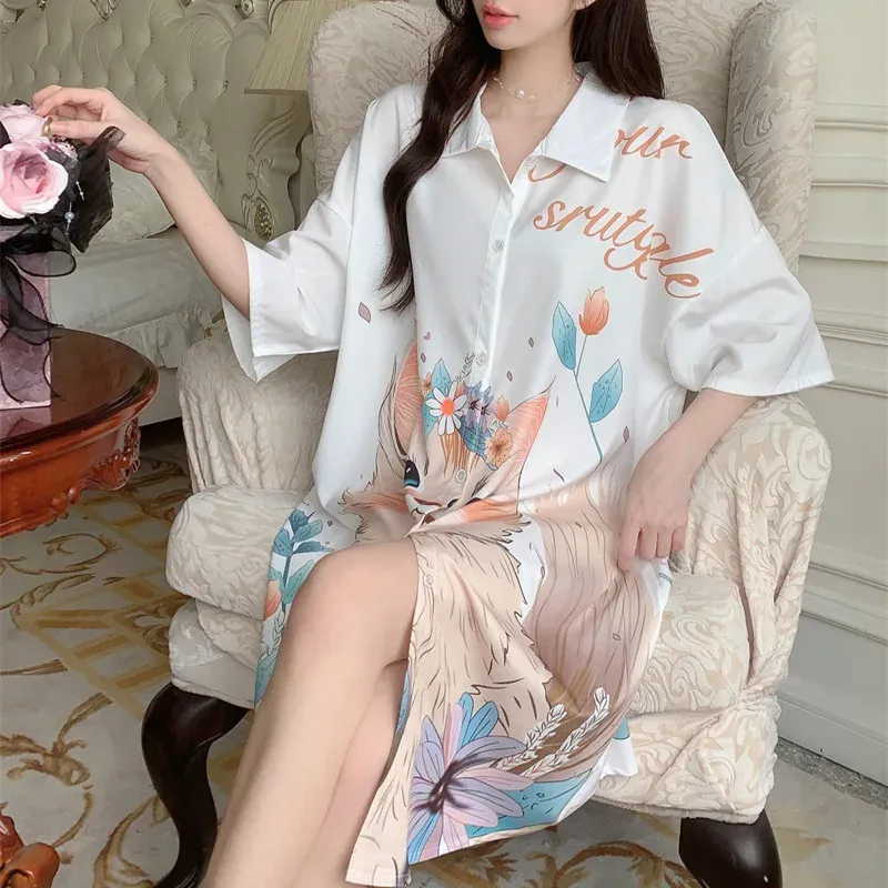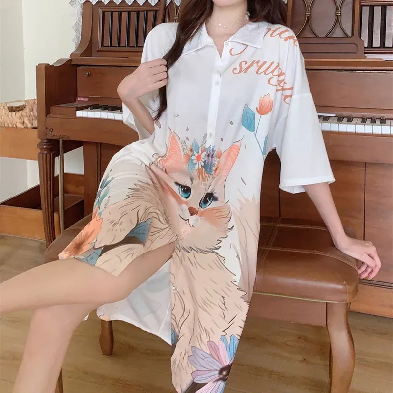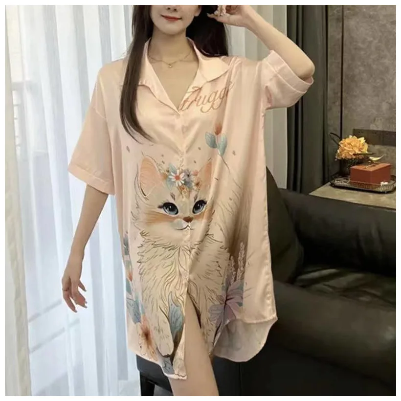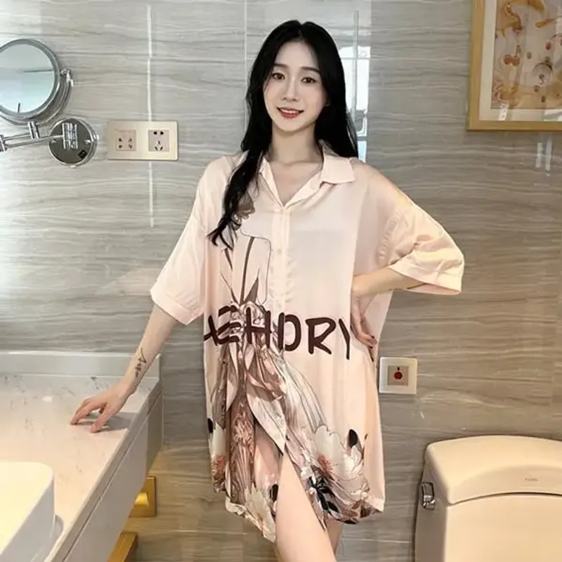 New Women Short Sleeve Ice Silk Sleep Dress Nightgown Plus Size 4XL Pajamas Shirt Fashion Sundress Loose Home Clothes