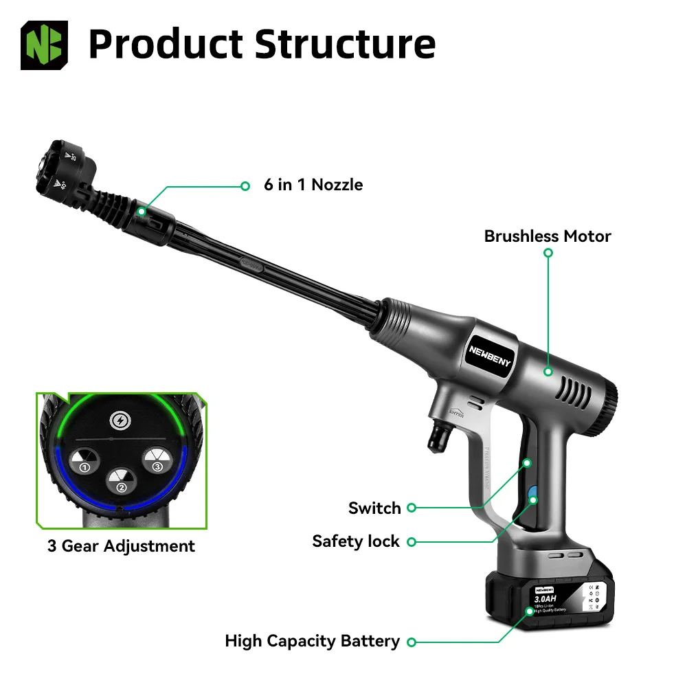 NEWBENY 200Bar Brushless Electric High Pressure Washer 3 Gear Cordless Car Cleaning Garden Irrigation Tool For 18V Battery