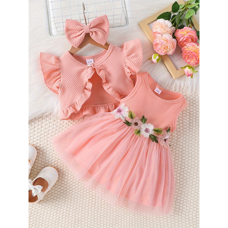 Newborn 2024 Baby Girls Dress Summer Waist Flower Vest Sleeveless Short Top Sweet Girl Lace Mesh Dress