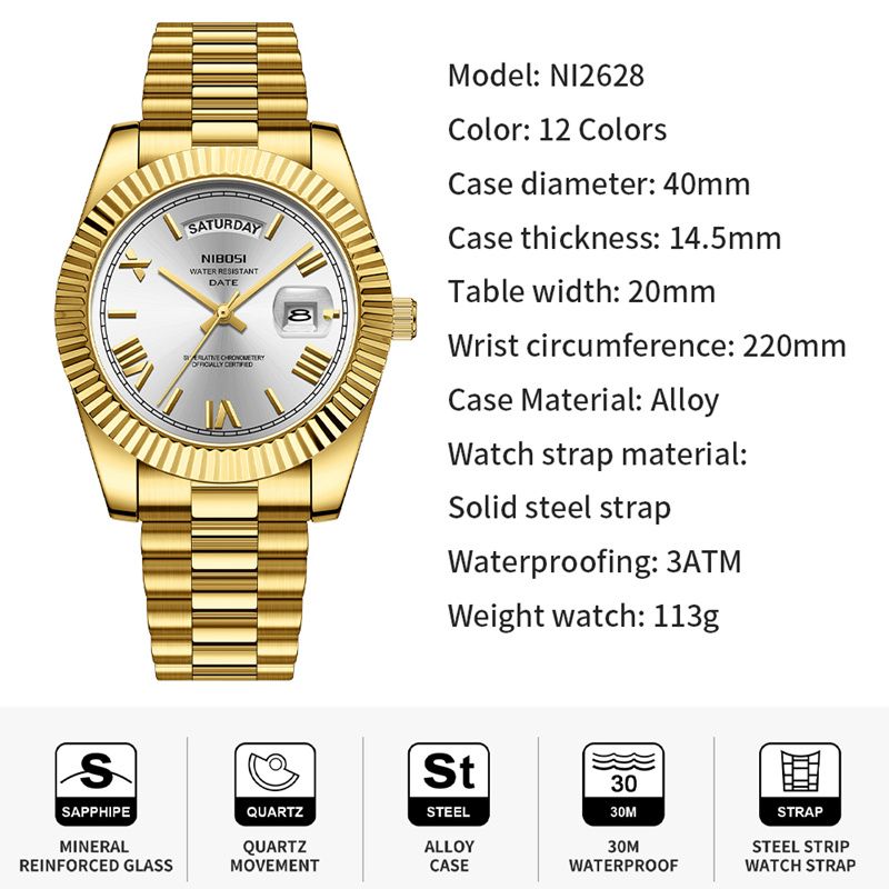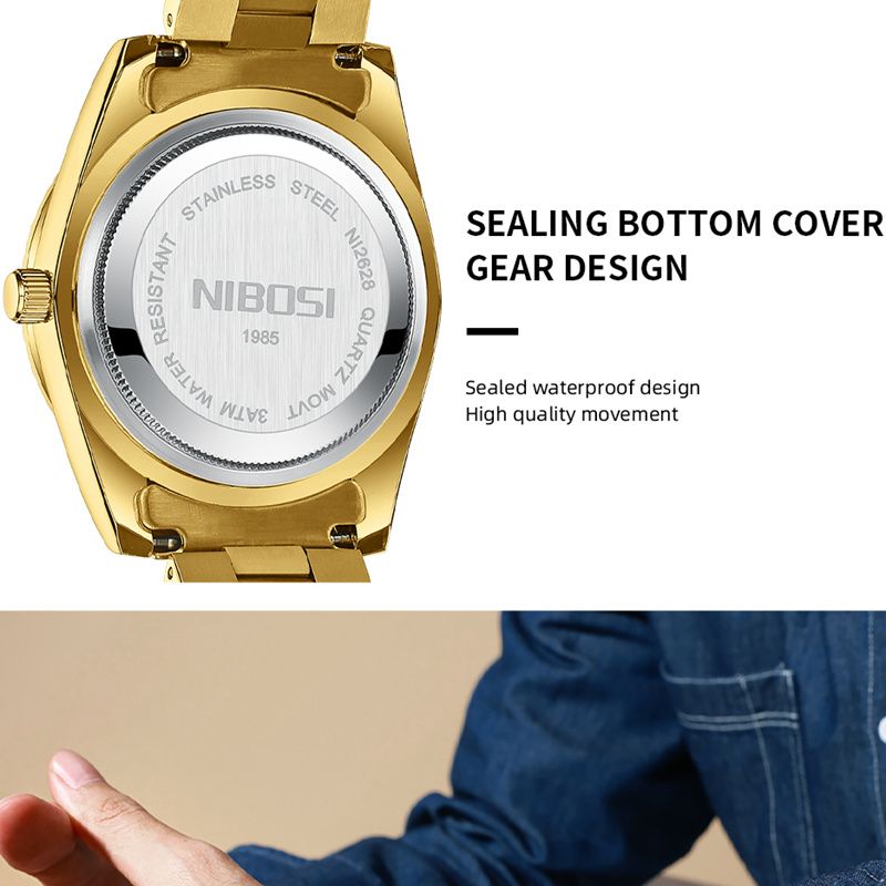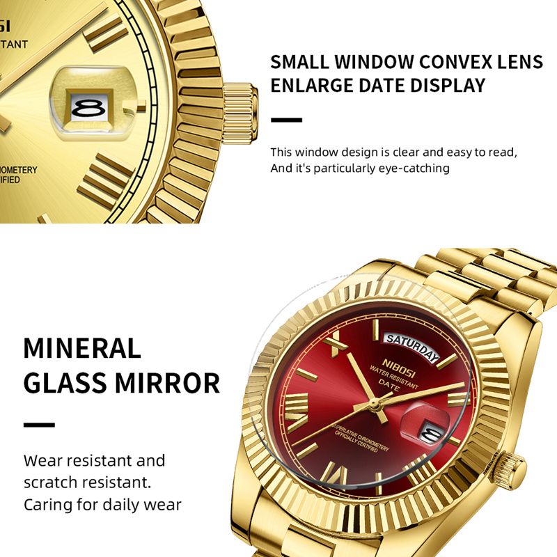 NIBOSI Brand Luxury Gold Red Quartz Watch for Men Stainless Steel Waterproof Luminous Date Week Fashion Men Watches Reloj Hombre