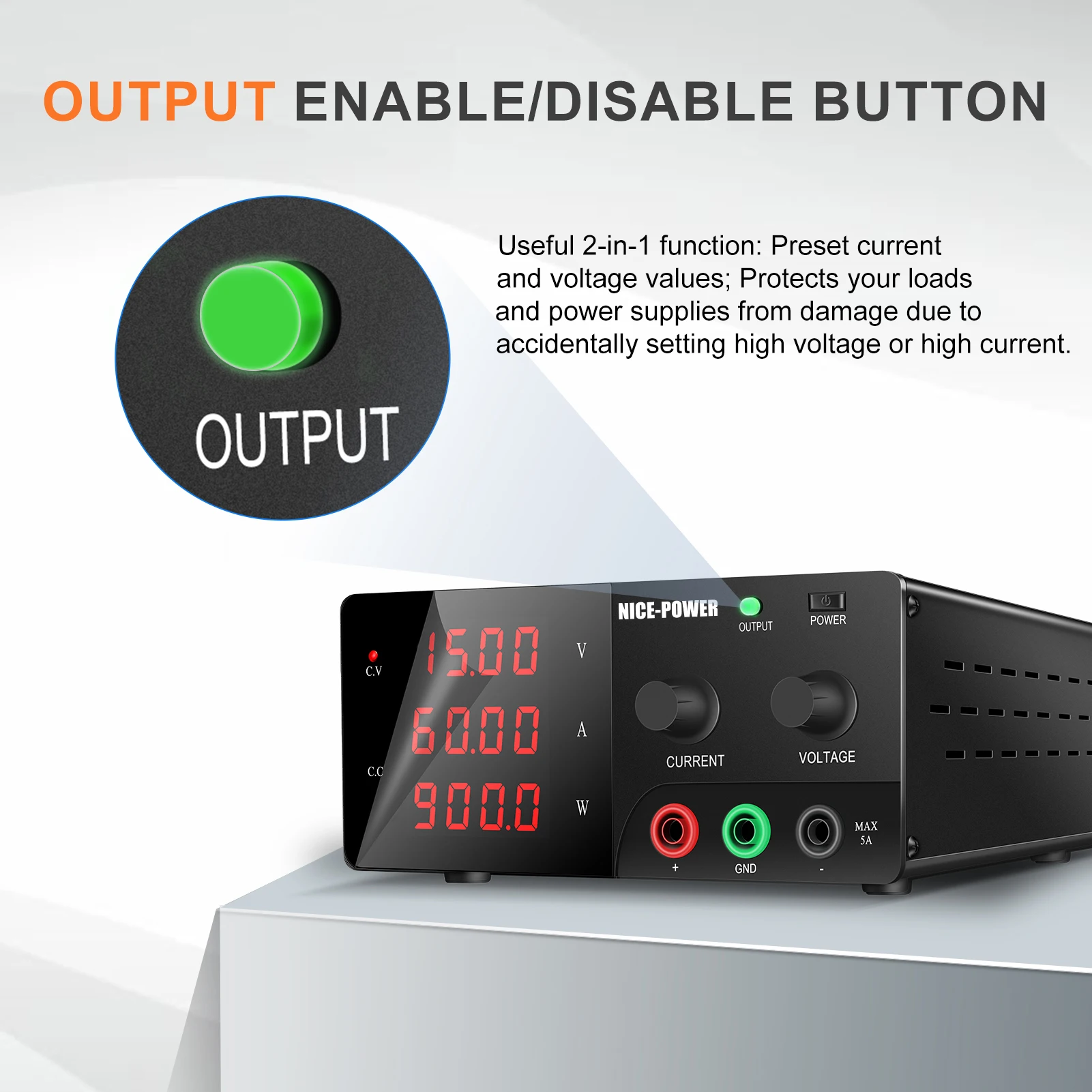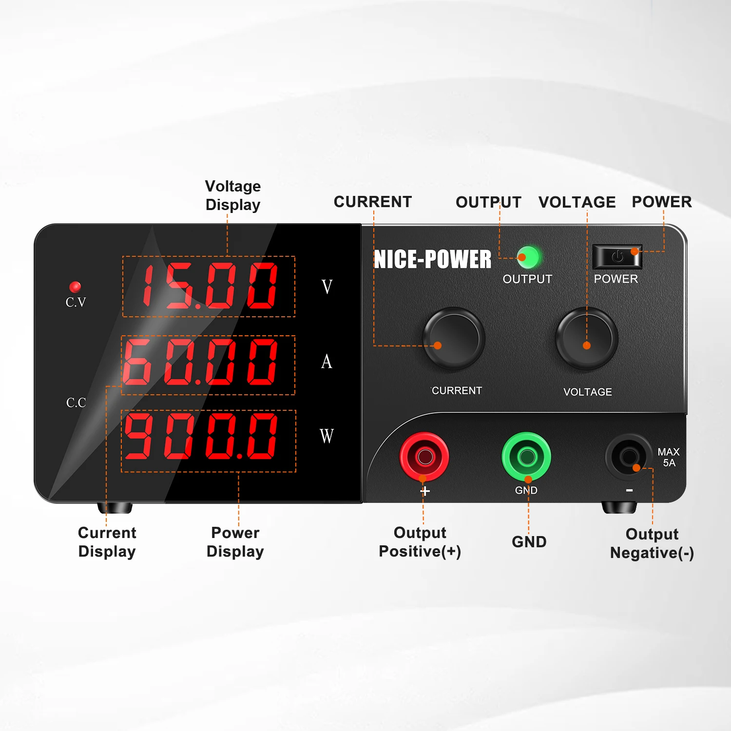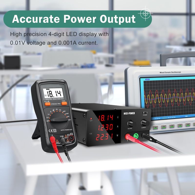 š„ć 4-Digit LED Display, Power Displayć DC Power Supply is a professional power conditioning unit with high resolution of 0.01V and 0.001A. The backlit 4-digit LED display of the bench power supply shows the voltage current and power values more accurately and is easy to see even in low light conditions.