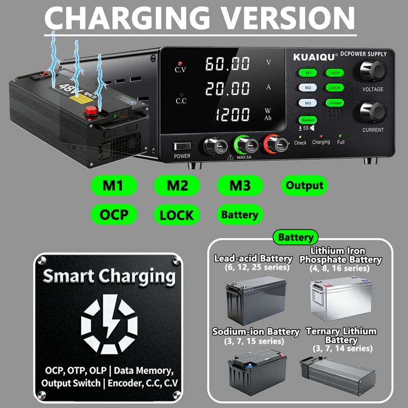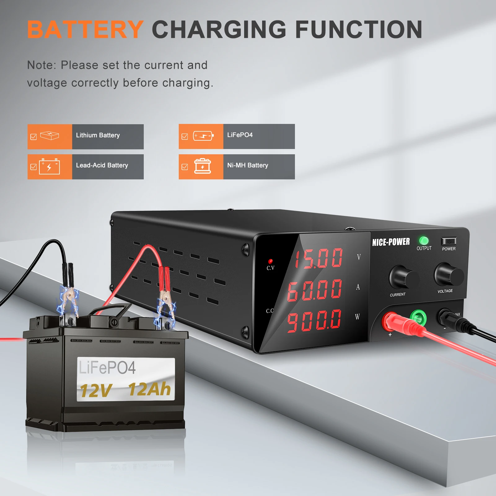 š„ćCE & FCC Certification, Widely Usedć Lab power supplies have passed CE & FCC Certification. This benchtop power supply is suitable for battery charging ( LiFePO4, lead acid batteries, etc.), labs, schools, electronics repair, electrolysis, electroplating, lamp testing, aging testing, DIY, research and teaching.