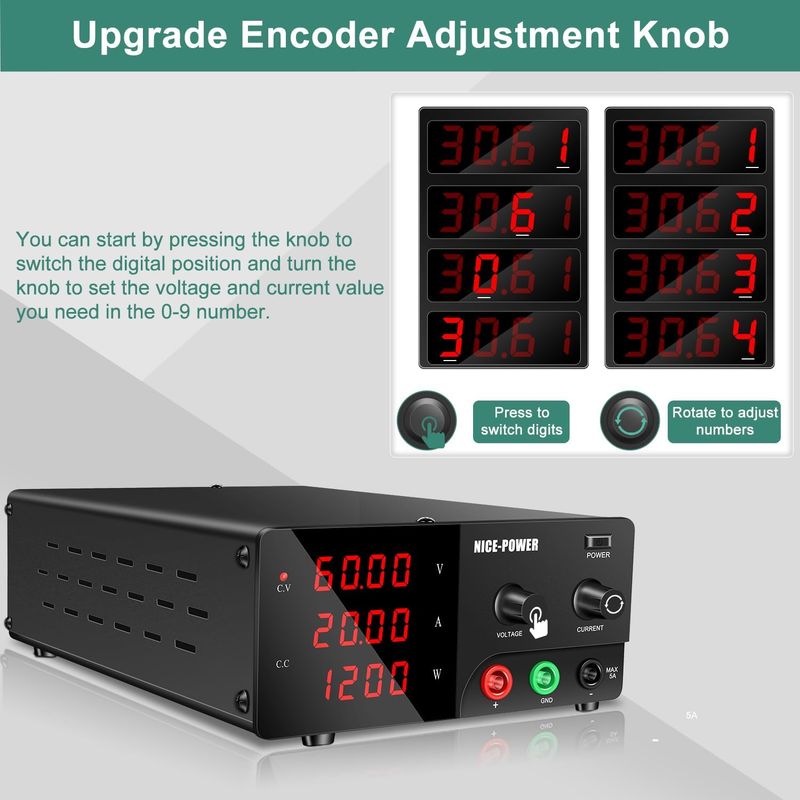 š„ćUpgrade High-precision Encoder Knobć Just "set" voltage and current instead of "adjust". The encoder switch replaces the potentiometer switch, the digits are switched by pressing the knob and each digit can be set in the range 0-9 by turning the knob. Makes work easier and more efficient!