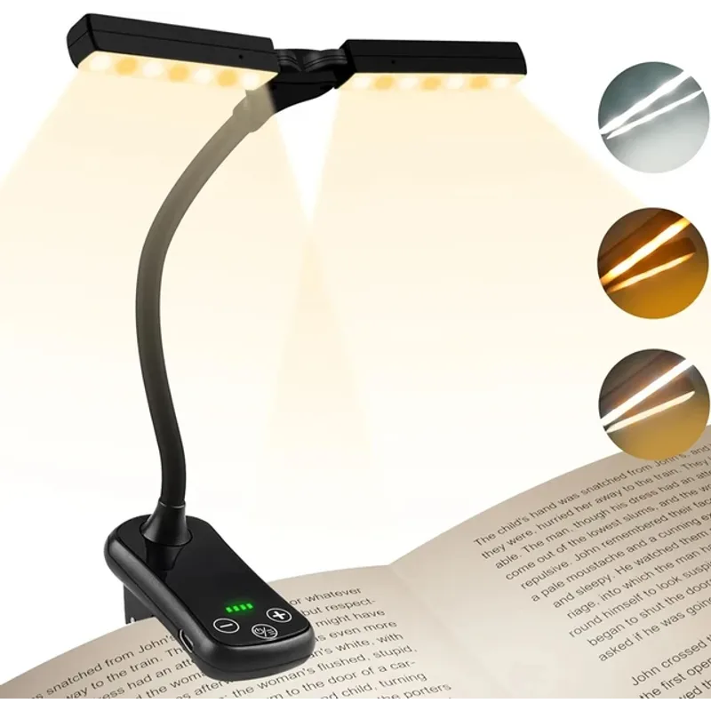 Dual Heads 14 LED Touch Control Reading Light with 3 Colors&8 Brightness USB Rechargeable Eye Care Book Light Clip on Book/Desk