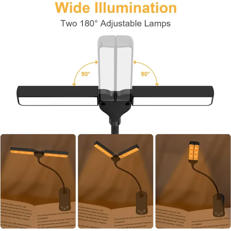 【Stepless Dimming 24 Modes】The reading light has 3 color temperatures(1600 to 6000k) x 8 brightness settings (Low, Medium, High), 24 modes in total, can adjust the brightness infinitely, with maximum brightness 100lm and you can always find the light you want! The double lamp head illuminates evenly, without flicker and glare, and does not hurt the eyes. Let it accompany you to read, work, study, sew, sleep and more.