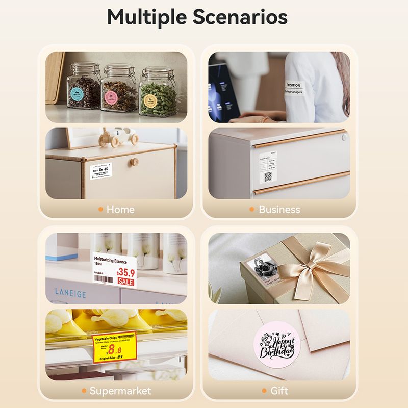 *Applicable industries: Photo-printing, receipts, note, gift, clothing, jewelry, supermarket, fresh food, medicine, cables, etc.;