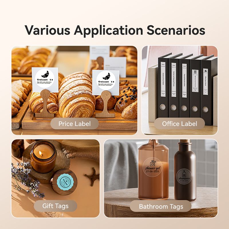 B21 label maker supports 20-50 mm width labels, Which can be widely used in Food, Medicine, Clothing,Jewelry, Grossery, Supermarket, Fixed Assets, Commercial, Small business, Factories areas and so on.