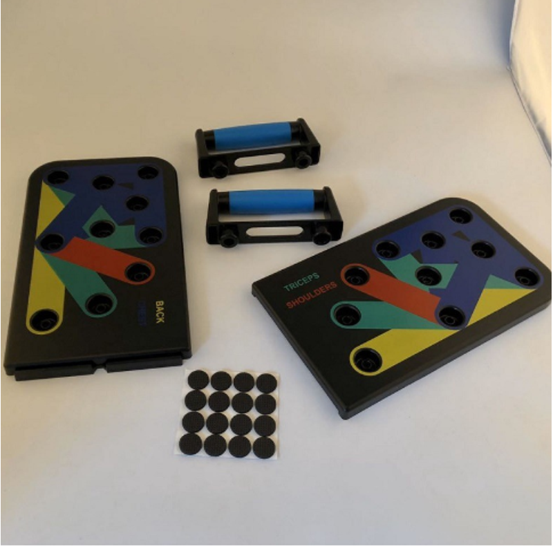 An innovative color-coded pushup board training system that strengthens and sculpts the entire upper body (chest, shoulders, back and arms while engaging your total core.