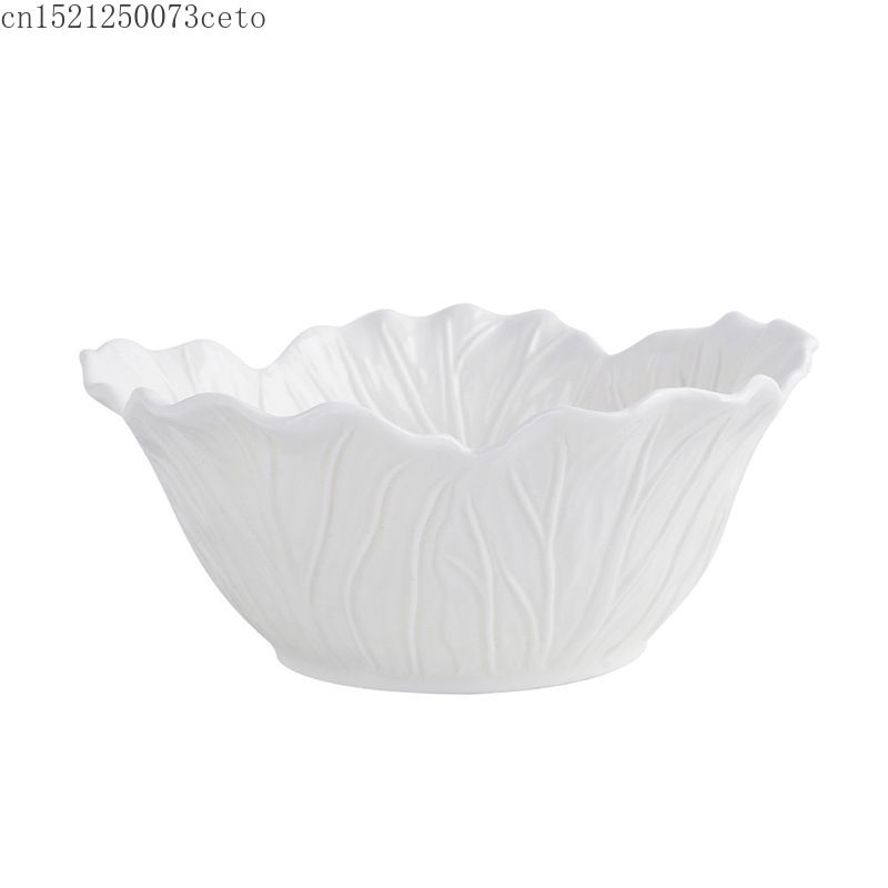 Nordic Luxury Flower Ceramic Bowl Pure white creative cabbage relief tableware Fruit and vegetable salad bowl, large soup bowl