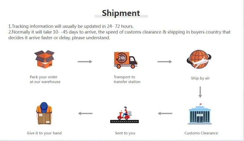 Please note that delivery times are estimates and may vary due to customs procedures, carrier delays, weather conditions, or other unforeseen circumstances.