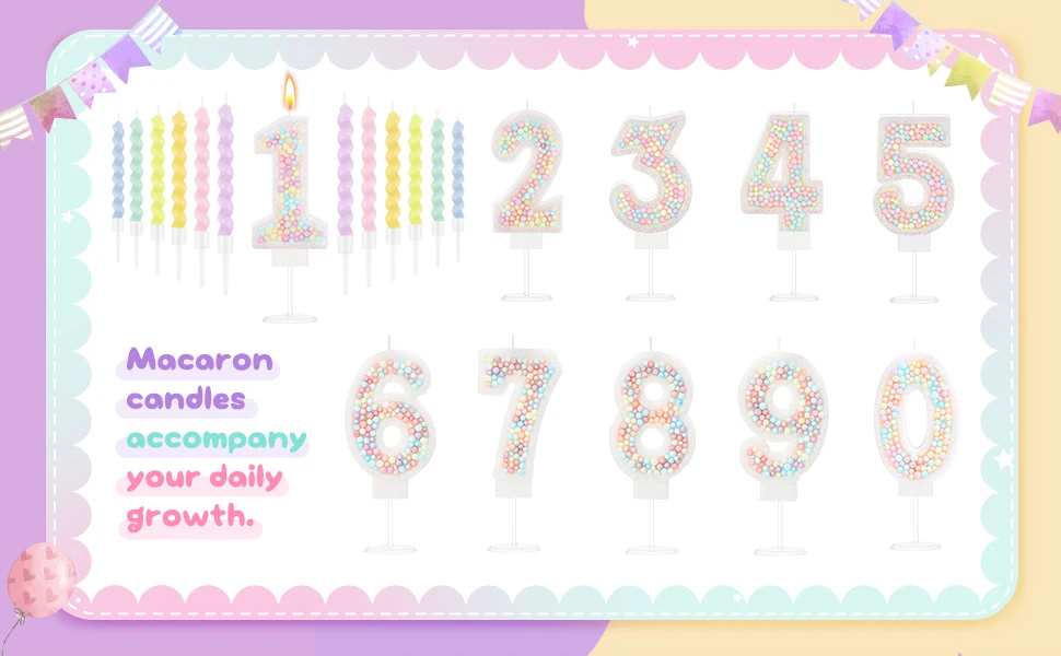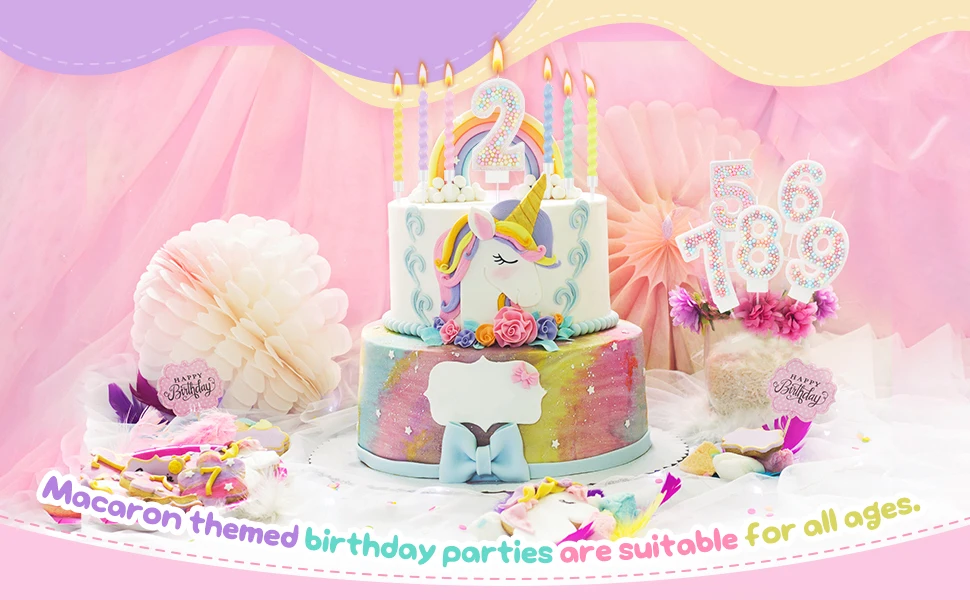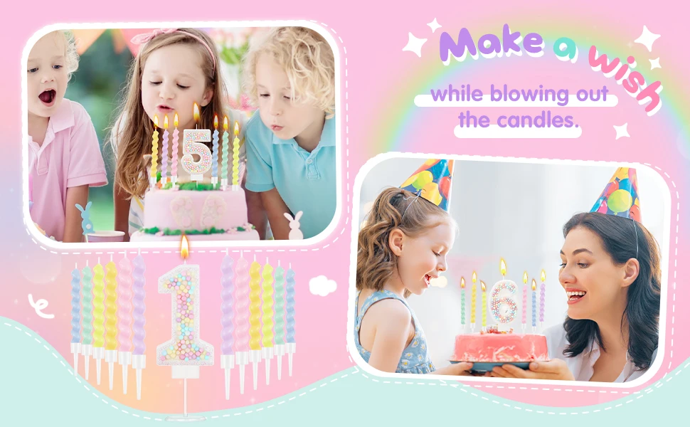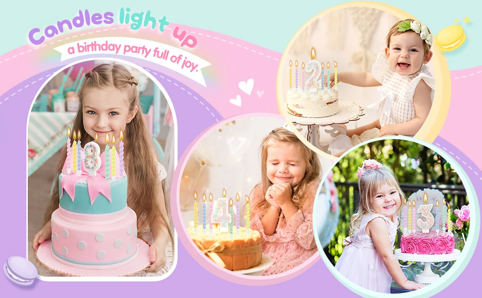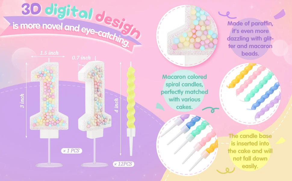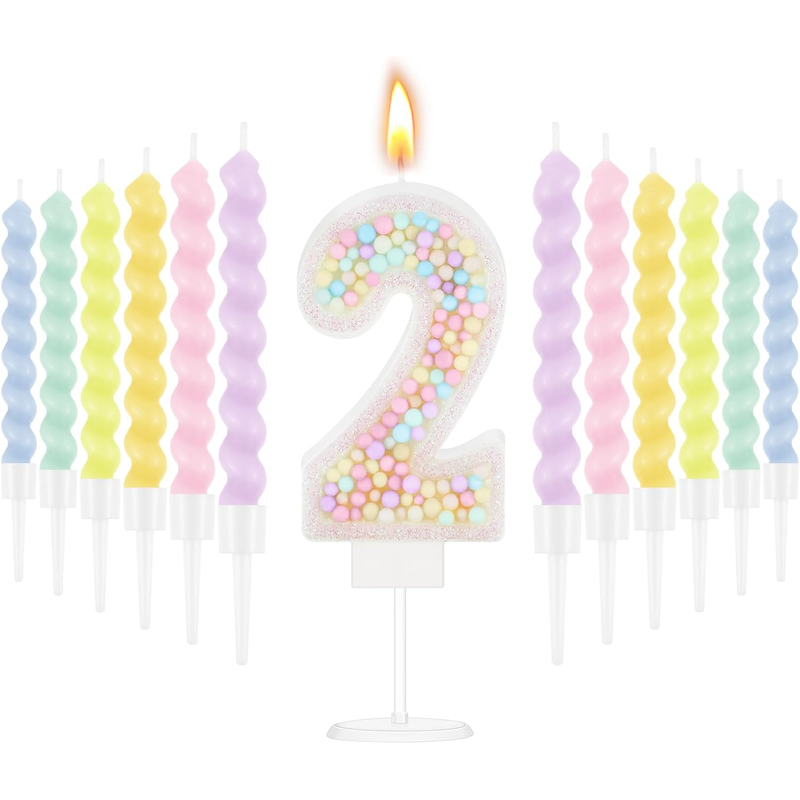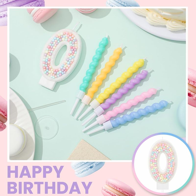Number Birthday Candle Macaron Pastel Glitter 3D Number Candle with 12 Pcs Rainbow Spiral Candles in Holders for Girl Boy Cake