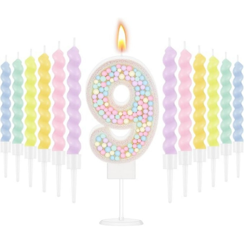 Number Birthday Candle Macaron Pastel Glitter 3D Number Candle with 12 Pcs Rainbow Spiral Candles in Holders for Girl Boy Cake
