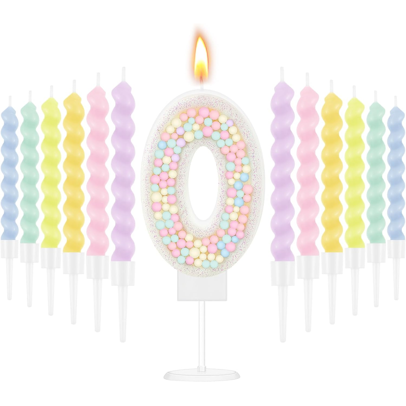 Number Birthday Candle Macaron Pastel Glitter 3D Number Candle with 12 Pcs Rainbow Spiral Candles in Holders for Girl Boy Cake