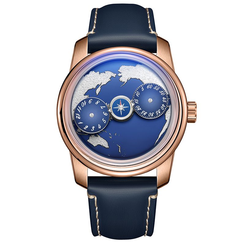 OBLVLO Fashion Men Three Wheels Automatic Watch Creative Earth Dial Blue Luminous Leather Strap Watches for Businessmen JM-EARTH