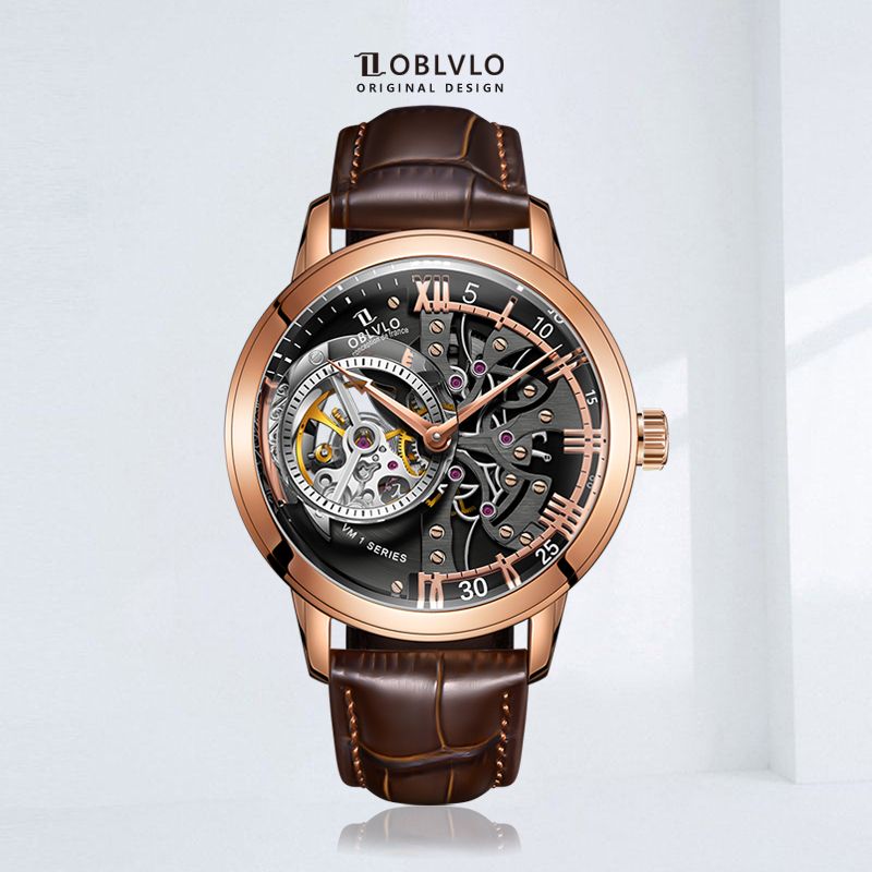 OBLVLO Retro Casual Men Skeleton Automatic Watches Mechanical Calfskin Strap Mineral Crystal Glass Waterproof Clock Dial 45mm VM