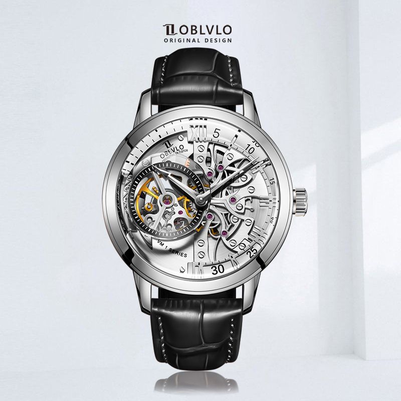 OBLVLO Retro Casual Men Skeleton Automatic Watches Mechanical Calfskin Strap Mineral Crystal Glass Waterproof Clock Dial 45mm VM