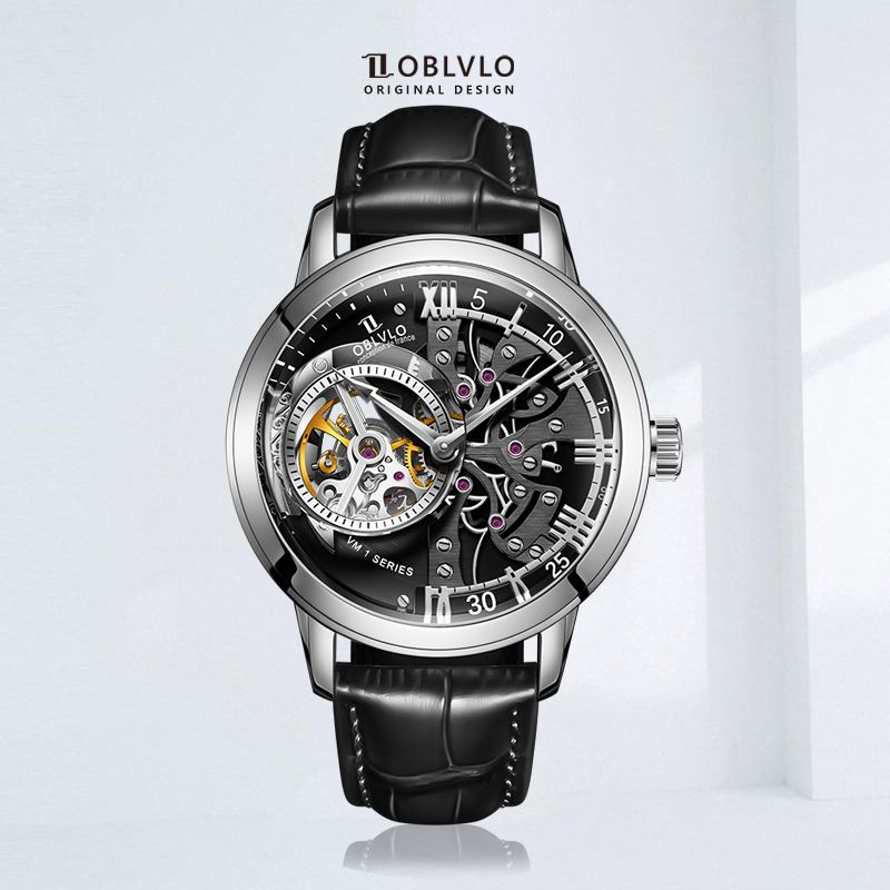 OBLVLO Retro Casual Men Skeleton Automatic Watches Mechanical Calfskin Strap Mineral Crystal Glass Waterproof Clock Dial 45mm VM