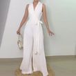 Office Ladies Lapel High Waist Romper Sexy Hollow Out Sleeveless Lace Up Pleated Jumpsuit Fashion Solid Color Wide Leg Playsuit