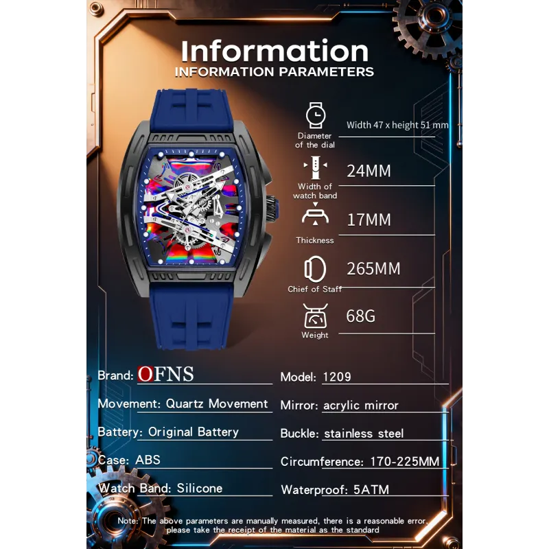 OFNS1209 Luxury Men Quartz Watch Silicone Strap Hollow Watches Mens Waterproof Sports Wristwatches Relogio Masculino