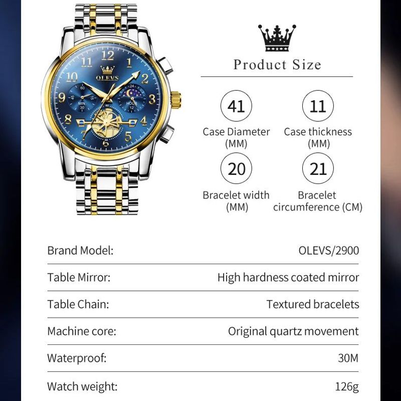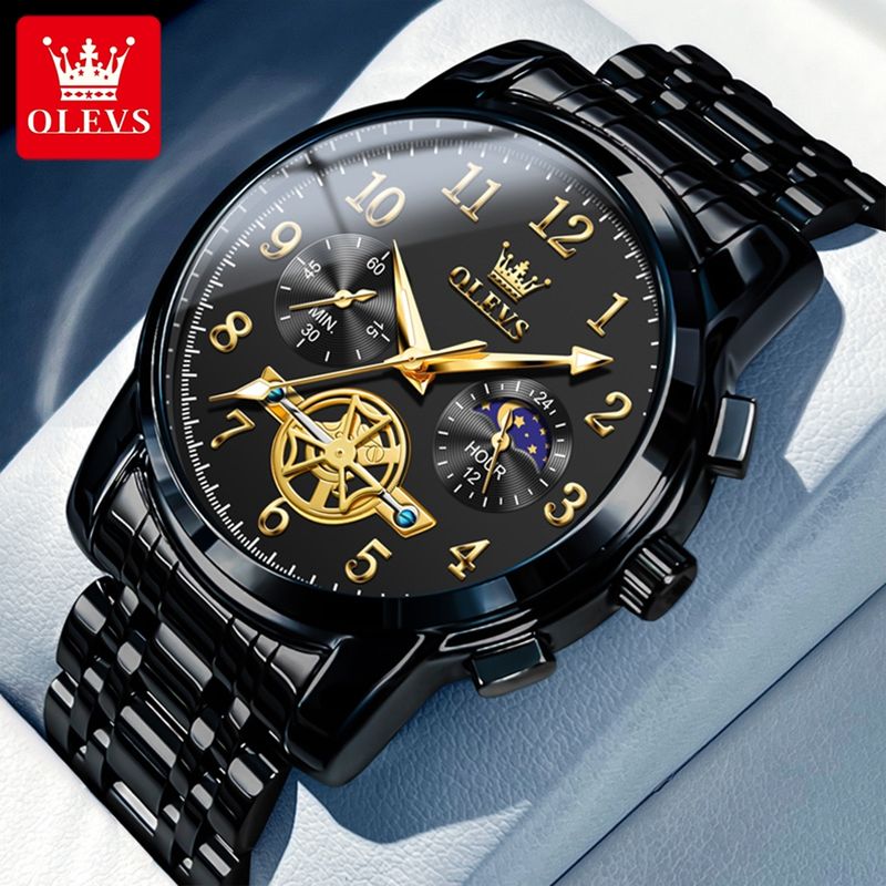 OLEVS 2900 Moon Phase Watch Men Stainless Steel Waterpoof Luminous Fashion Skeleton Chronograph Quartz Wrist Watch for Men NEW
