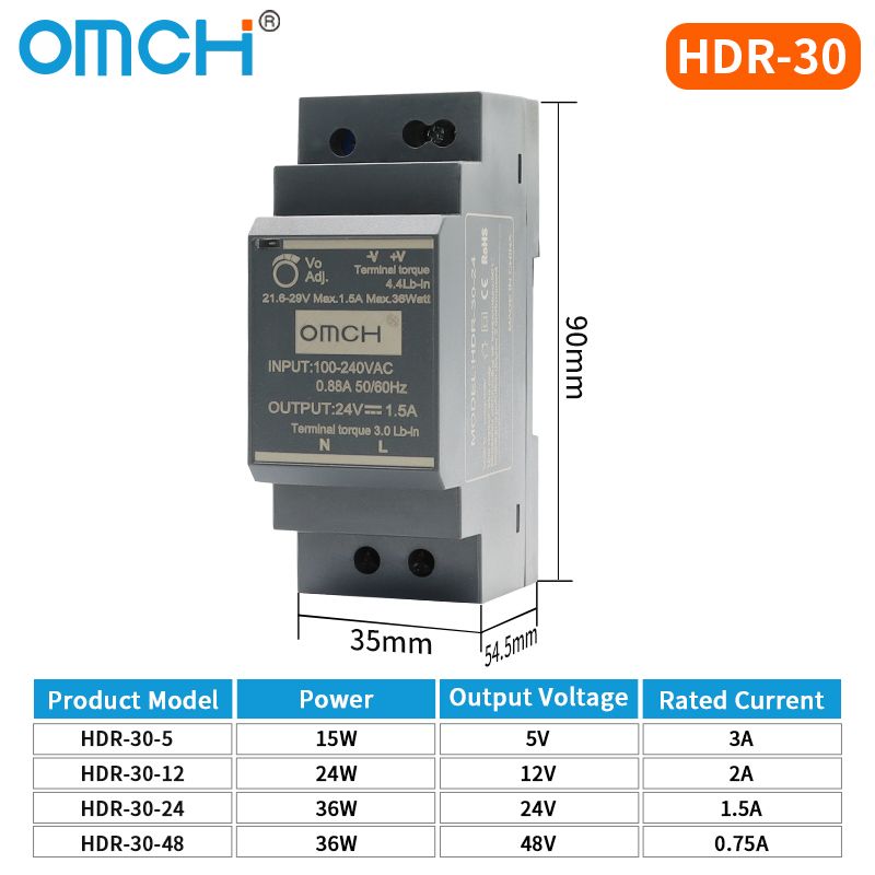 OMCH HDR Series DIN Rail Switching Power Supply HDR-15 100-240VAC 15W 30W 60W 100W AC to DC Voltage 5V 12V 24V 48V 0-7.1A SMPS