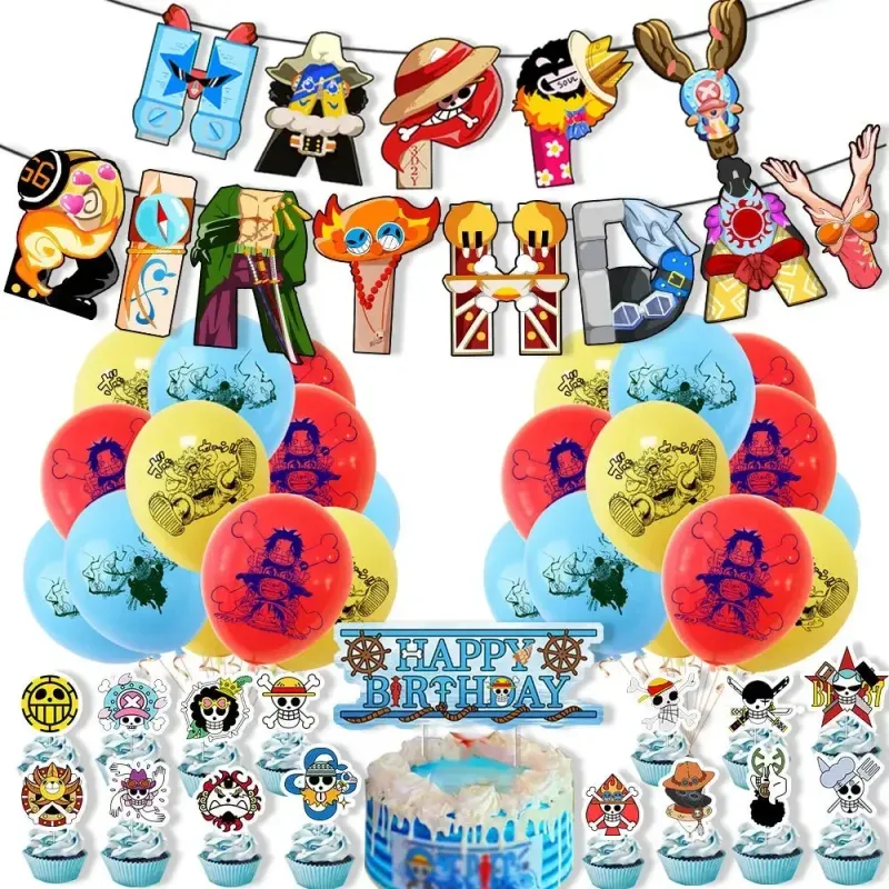 One Piece Birthday Party cutlery plate Disposable Banner Cake Topper Hanging Flag One Piece Luffy Balloons Birthday Decorations