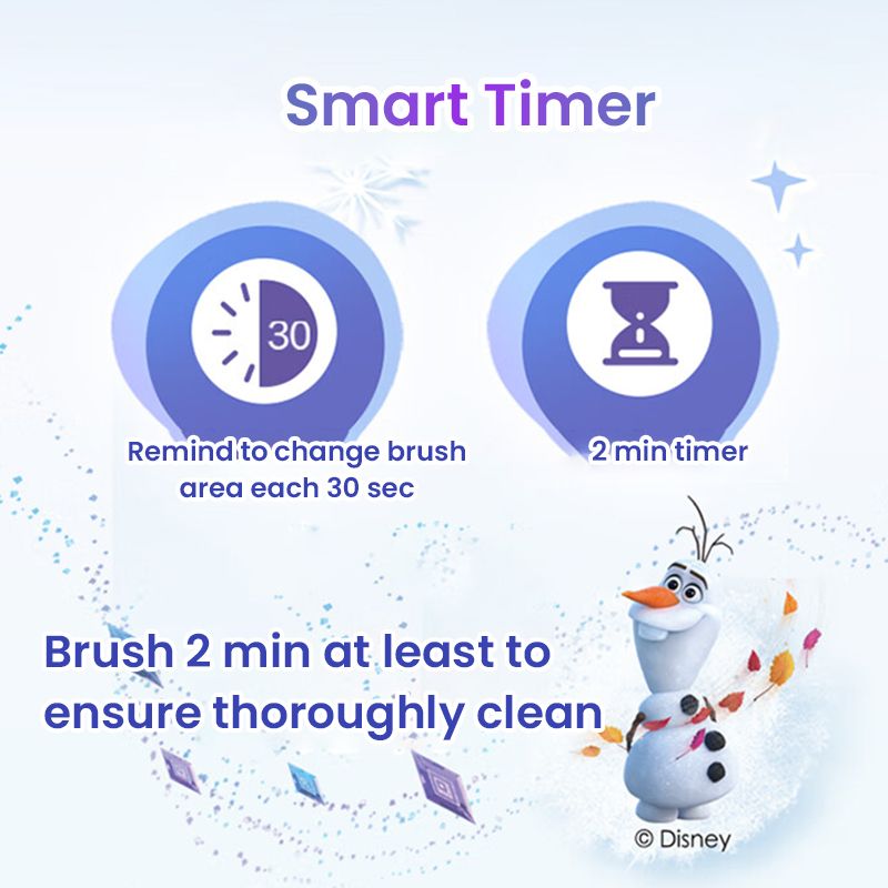 Smart timer: remind to change brush area every 30 sec., 2 min timer make sure to brush long enough to clean thoroughly