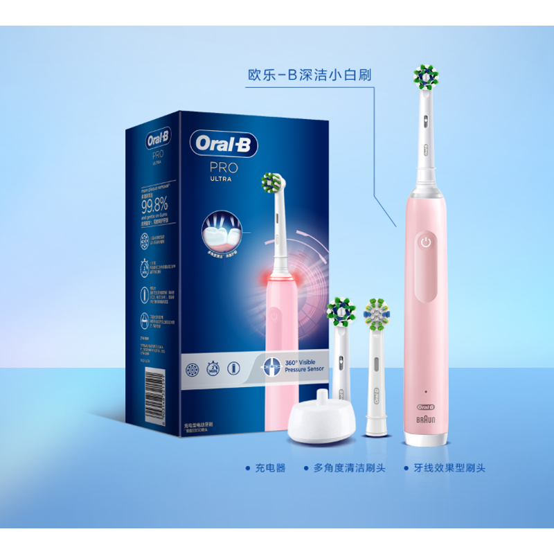 Oral B Pro Ultra Electric Toothbrush Pro 4 Pressure Sensor 48,800 Strokes/Min 2 Min Timer 30s Reminder 4 Modes 3 Brush Heads