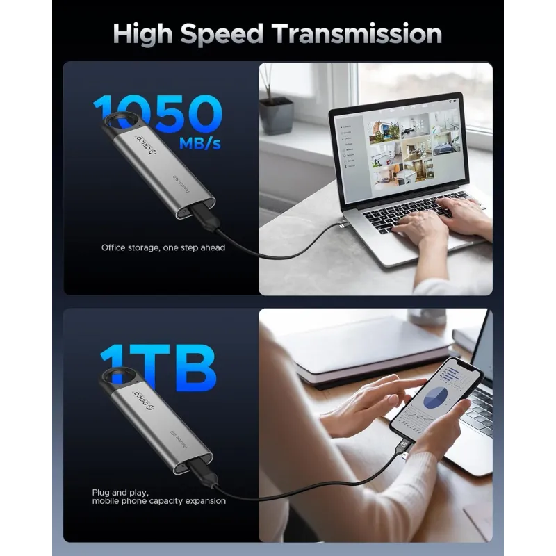 ORICO portable SSD is made of aluminum alloy, which ensures efficient data transfer even during long hours of use. Dustproof and drop-proof, it ensures data security even in harsh environments and eliminates data loss.