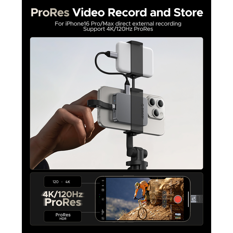 Seamlessly record and store 4K ProRes HDR videos directly from your iPhone 15/16 Pro/Pro Max. Edit directly from the SSD without the need for time-consuming file transfers.