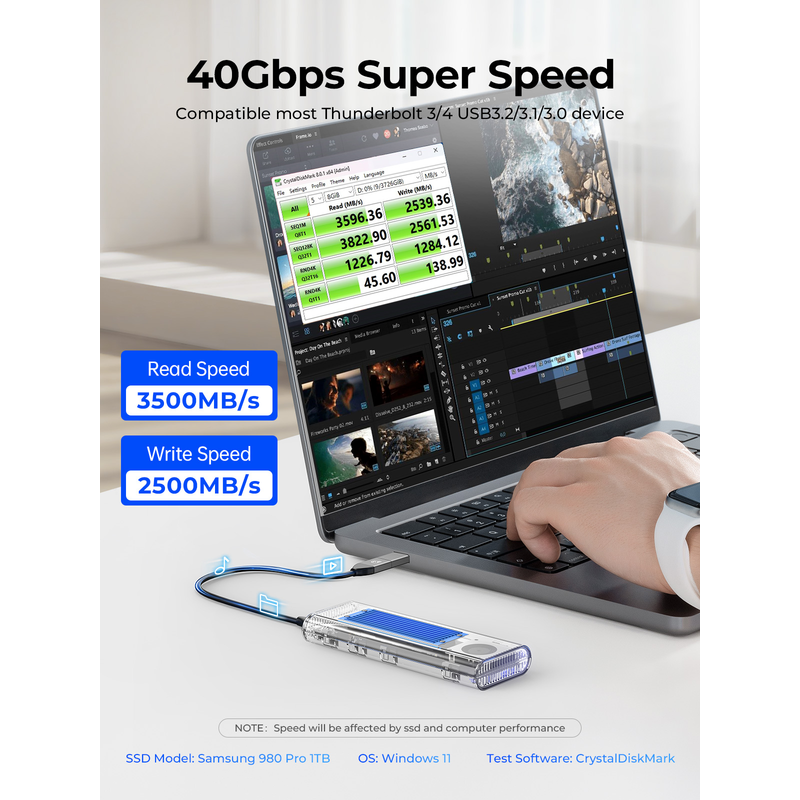 With USB4 Type C output interface, it supports the maximum transmission speed up to 40Gbps. The measured maximum continuous read speed can reach 3500MB/s, and the continuous write can reach 2500MB/s.(This data comes from ORICO laboratory. SSD Model: Samsung 980 Pro 1TB.OS: Windows 11.Test Software: CrystalDiskMark). Speed will be affected by ssd and computer performance.
