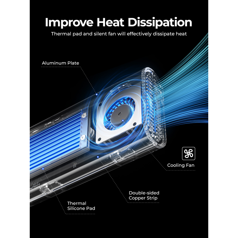 Built-in metal cooling vest and built-in fan,silicone thermal pad and aluminium body, heat dissipation is fast.
