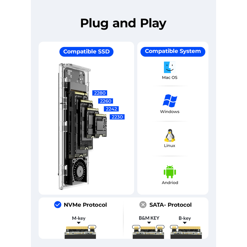 Compatible with NVMe SSD in sizes 2230/2242/2260/2280.such as M.2 NVMe M Key, B&M Key SSD.Suitable for gaming, video editing, research, design