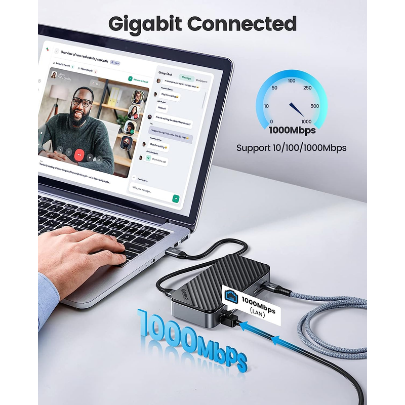 The USB C hub is equipped with one USB A port and one USB C ports, as well as a built-in M.2 SSD slot, both supporting USB 3.2 Gen2 10Gbps speeds, which can transfer/return 1GB of video, music, photos and other files in just 1 second. There are also two USB 3.0 USB-A ports that support 5Gbps transfers.(PS: Due to the limitation of Apple M1 chip, the reading and writing speed is lower than that of non M1 chip computer)